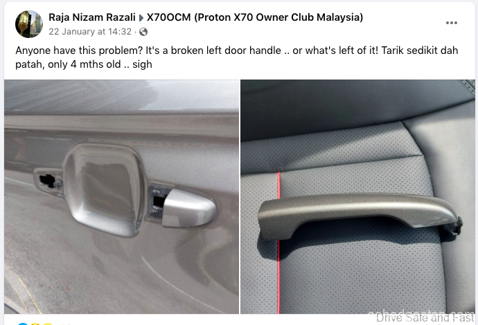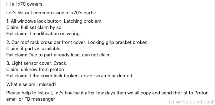 Jika anda layari pelbagai halaman pemilik Facebook Proton X70, anda akan melihat semakin ramai pemilik yang tidak berpuas hati dan isu-isu yang tidak masuk akal yang diketengahkan. Contohnya, untuk servis X70, TIADA minyak enjin. Apabila bateri kereta anda gagal, anda mesti menggunakan hanya bateri kereta Proton dan jenama lain tidak dibenarkan untuk mengelakkan kehilangan waranti anda. Kemalangan kecilan Proton X70 tidak boleh diperbaiki kerana TIDAK ada alat ganti bampar.