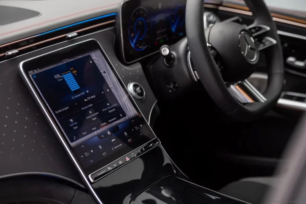 Tiada Hyperscreen pada versi EQE ini, tetapi terdapat skrin sentuh OLED, paparan pemandu dan paparan headsup dengan navigasi realiti MBUX. Pad pengecasan Qi tanpa wayar, Apple CarPlay dan Android Auto ditampilkan dan bunyi datang dalam bentuk sistem sekeliling 3D Burmester.