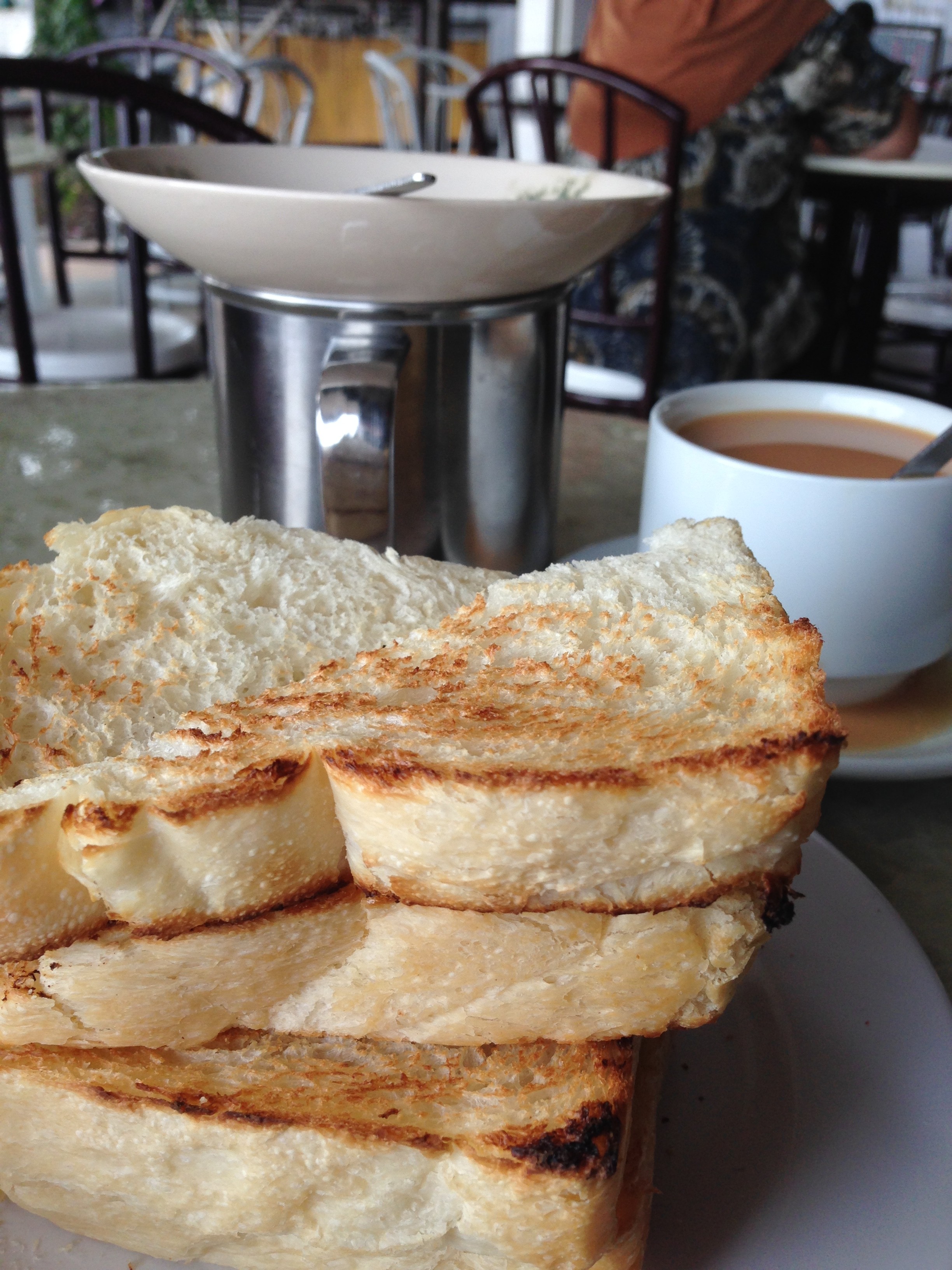 Dengan itu … Kedai Kopi Hai Peng ini boleh tahan. Roti yang dia pakai roti ori kedai kopi tiam. Tebal dan lembut dan … dan … dia pakai butter bukan margarine. Tehnya memang rasa teh dan bukan rasa susu saja. Telur setengah masaknya memang setengah masak. Cuma dia bagi kita telur itu dalam kole air panas dan suruh kita tunggu 5 minit sebelum memecahnya. Lima minit. Jangan kurang. Kalau pecah kurang dari 5 minit ianya, well … cair.