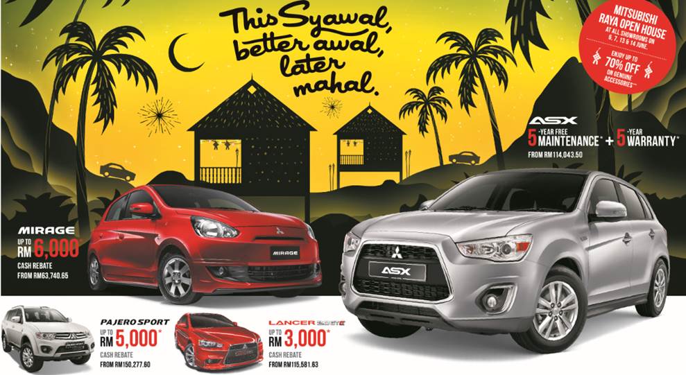 Bersempena dengan sambutan Raya tahun ini, Mitsubishi Motors juga akan mengadakan rumah terbuka eksklusif di semua bilik pameran pada 6,7,13 dan 14 Jun. Hadiah* untuk mereka yang pandu uji dan membuat tempahan dan minuman akan dihidangkan di semua bilik pameran.