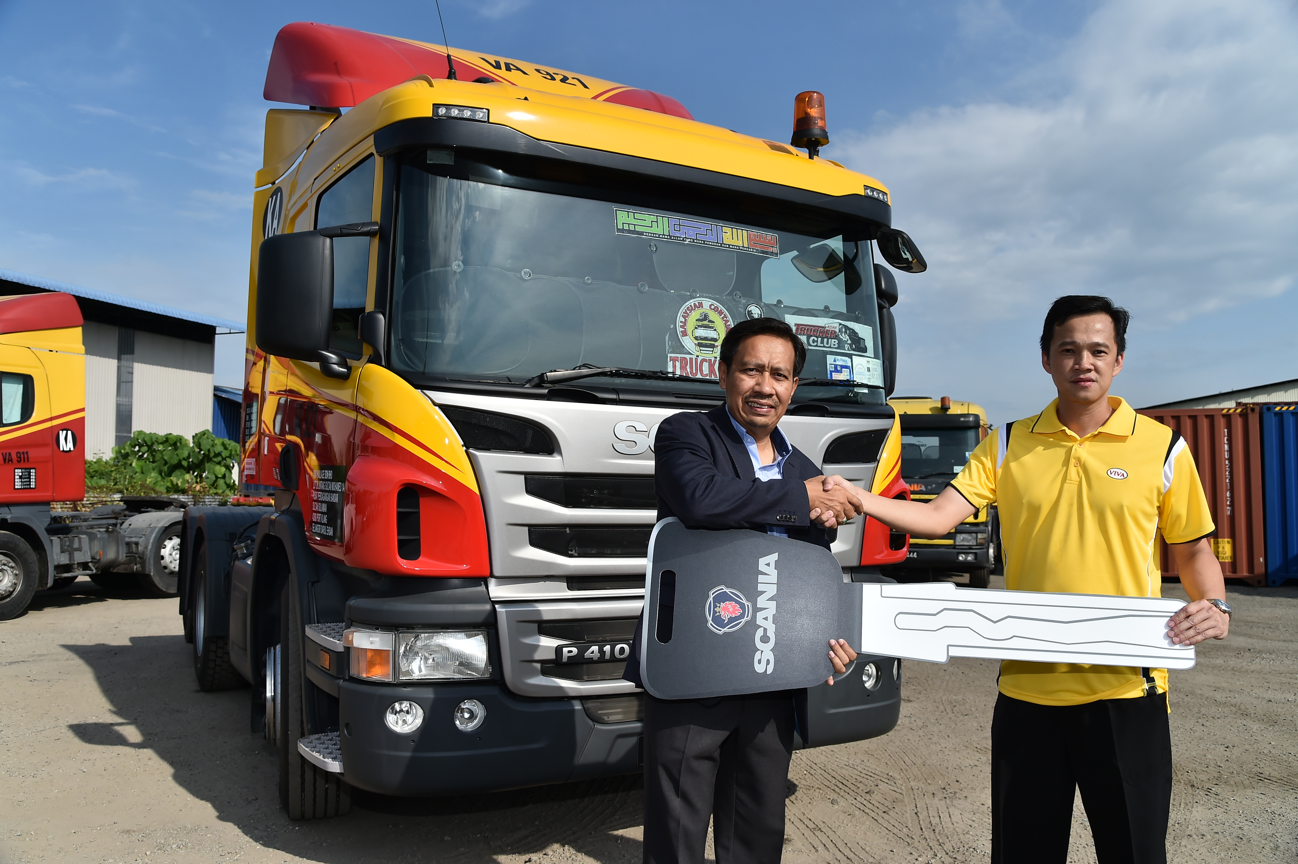 Trak ini diserahkan oleh Tuan Haji Idros Puteh, Pengarah Jualan Scania Asia Tenggara kepada Encik Tee Wah meng, Pengarah Viva Haulage Sdn Bhd baru-baru ini.