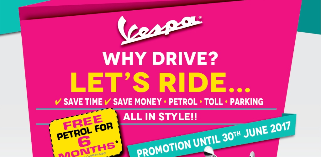 Pelanggan yang membeli Vespa di mana-mana pengedar sah di seluruh negara sehingga 30 Jun ini layak untuk mendapat minyak percuma selama enam bulan (bergantung kepada model, dengan terma dan syarat).