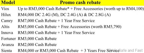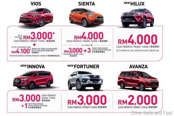 Syarikat itu terus memberikan promosi yang cemerlang kepada pelanggannya bulan Oktober ini dengan tawaran istimewa untuk pelbagai model Toyota. Rebat sehingga RM7,000 boleh didapati pada model terpilih dan dipadankan dengan aksesori Toyota yang bernilai sehingga RM5,790. Terdapat juga perkhidmatan berjadual percuma (termasuk alat ganti yang diperlukan) sehingga 3 tahun untuk model terpilih.