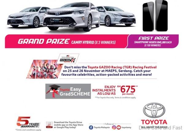 UMW Toyota Motor Sdn Bhd (UMWT) menawarkan pelanggan peluang untuk memenangi hadiah bernilai RM1 juta dalam “Toyota RM1,000,000 Bonanza” dari 1 Oktober hingga 31 Disember 2017. Hadiah bernilai RM1,000,000 termasuk tiga unit Toyota Camry 2.5 Hybrid sebagai Hadiah Utama dan 100 unit telefon pintar bernilai RM5,000 setiap satu.