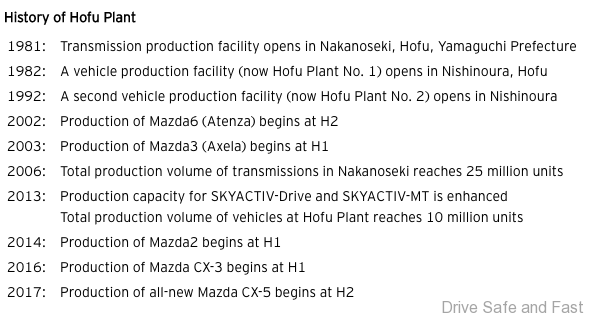 Mazda Motor Corporation hari ini memulakan pengeluaran crossover Mazda CX-5 yang baru di Loji Kilang Hofu No. 2 di Wilayah Yamaguchi untuk membolehkan syarikat itu memenuhi permintaan global yang semakin meningkat untuk crossover secara fleksibel dan cepat. Sehingga kini CX-5 telah dihasilkan di Loji Hiroshima syarikat dan di loji di China dan Malaysia.