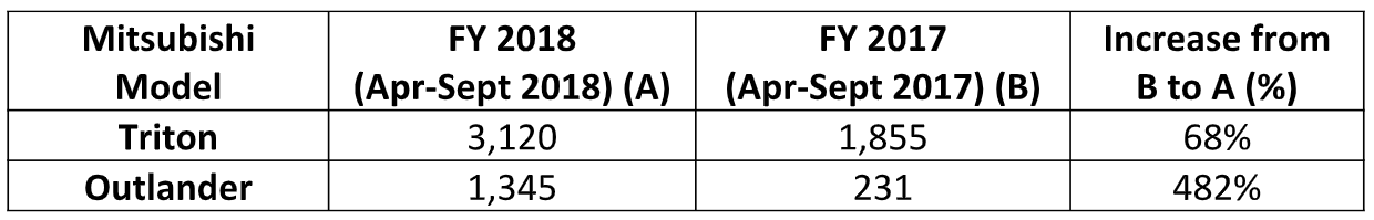 Menurut syarikat itu, sebahagian besar prestasi yang memberangsangkan ini didorong oleh peningkatan jualan model Triton dan Outlander seperti yang ditunjukkan dalam jadual yang berikut: