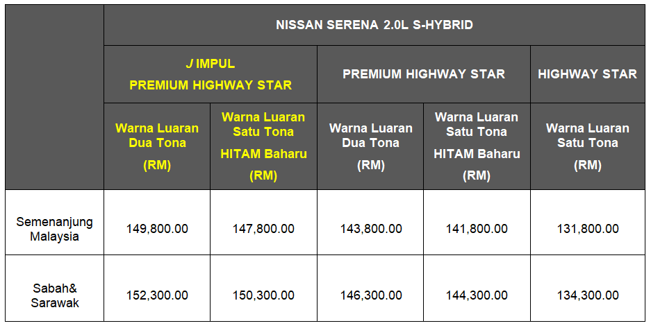 Berikut adalah senarai harga bagi semua varian Serena S-Hybrid:
