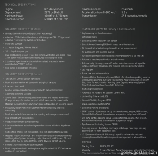 Harga termasuk perlindungan Jaminan 3 tahun tanpa batasan jarak pembatuan serta program penyelenggaraan percuma 3 tahun / 100,000 km yang mana lebih awal (Termasuk * Maserati Premium Service Plus 3 Tahun / 60,000 km).