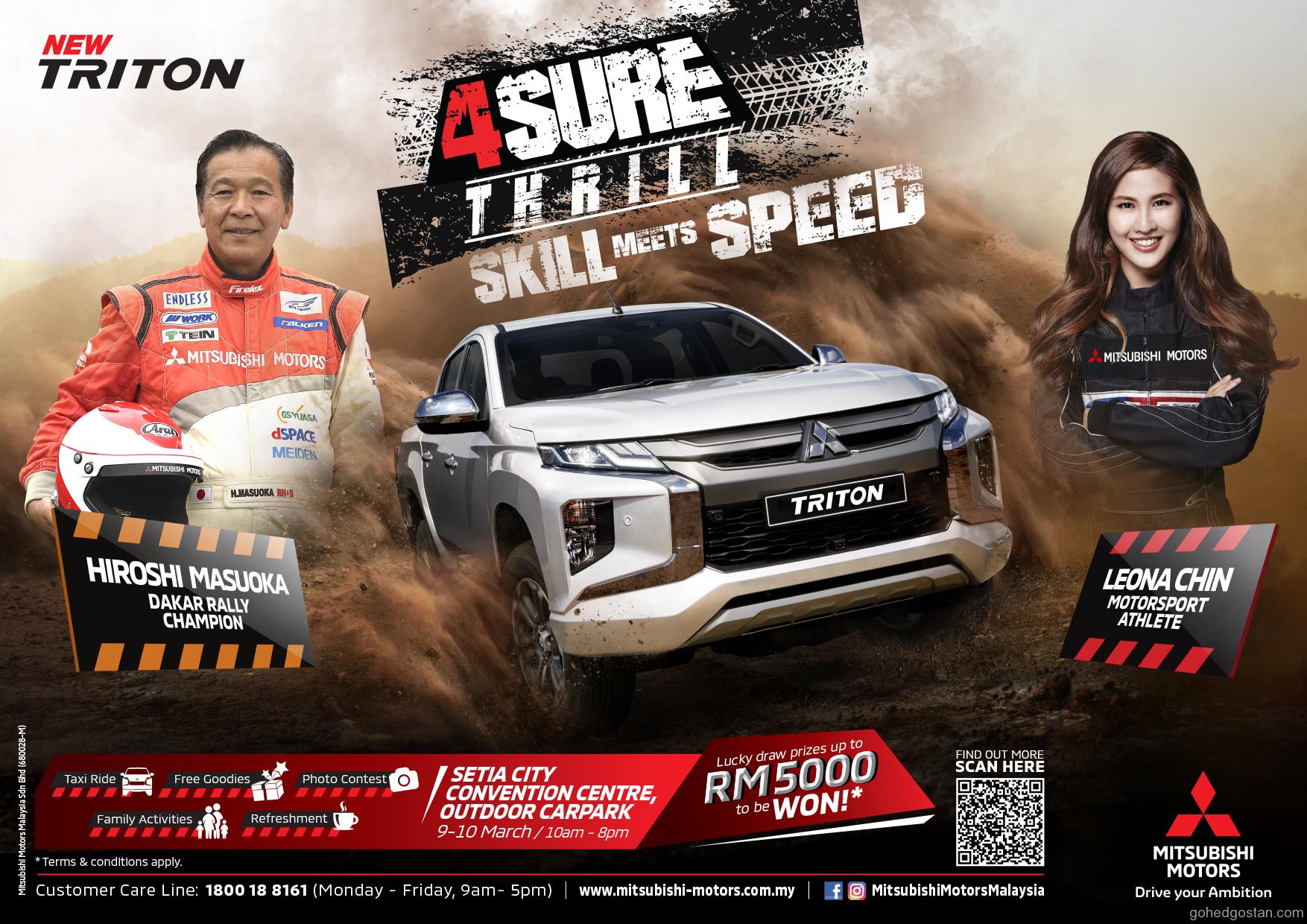 Mereka yang ingin merasai keseronokan pemanduan berkelajuan tinggi dan off-road di dalam Mitsubishi Triton baharu bolehlah berkunjung ke acara Mitsubishi 4Sure Thrill yang akan menampilkan juara dua kali Rali Dakar, Hiroshi Masuoka serta atlet sukan bermotor Malaysia, Leona Chin.