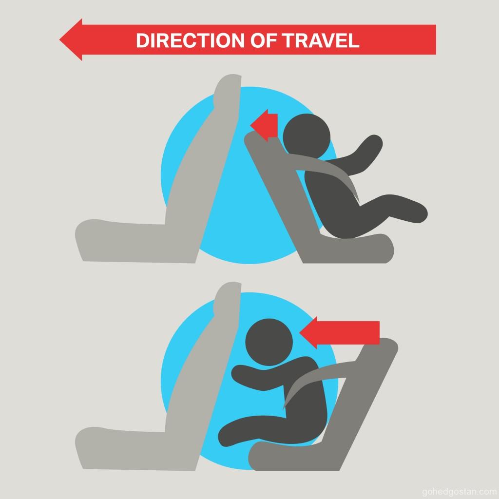 Antara semua kemalangan kereta yang berakhir dengan kehilangan nyawa atau kecederaan serius, 72% daripadanya disebabkan oleh perlanggaran dari hadapan, maka kerusi yang ditetapkan untuk menghala ke belakang boleh mengurangkan risiko kecederaan. Setiap titik yang penting pada bahagian belakang tubuh kanak-kanak dapat disentuh, maka ia membolehkan daya impak diserap dengan lebih baik oleh kerusi yang dilengkapi dengan pad lembut ini. Sebaik sahaja impak perlanggaran terhasil, kerusi yang menghala ke belakang membahagikan daya impak ini secara serata di bahagian tubuh belakang serta leher penumpang kanak-kanak berkenaan sambil membekalkan sokongan.