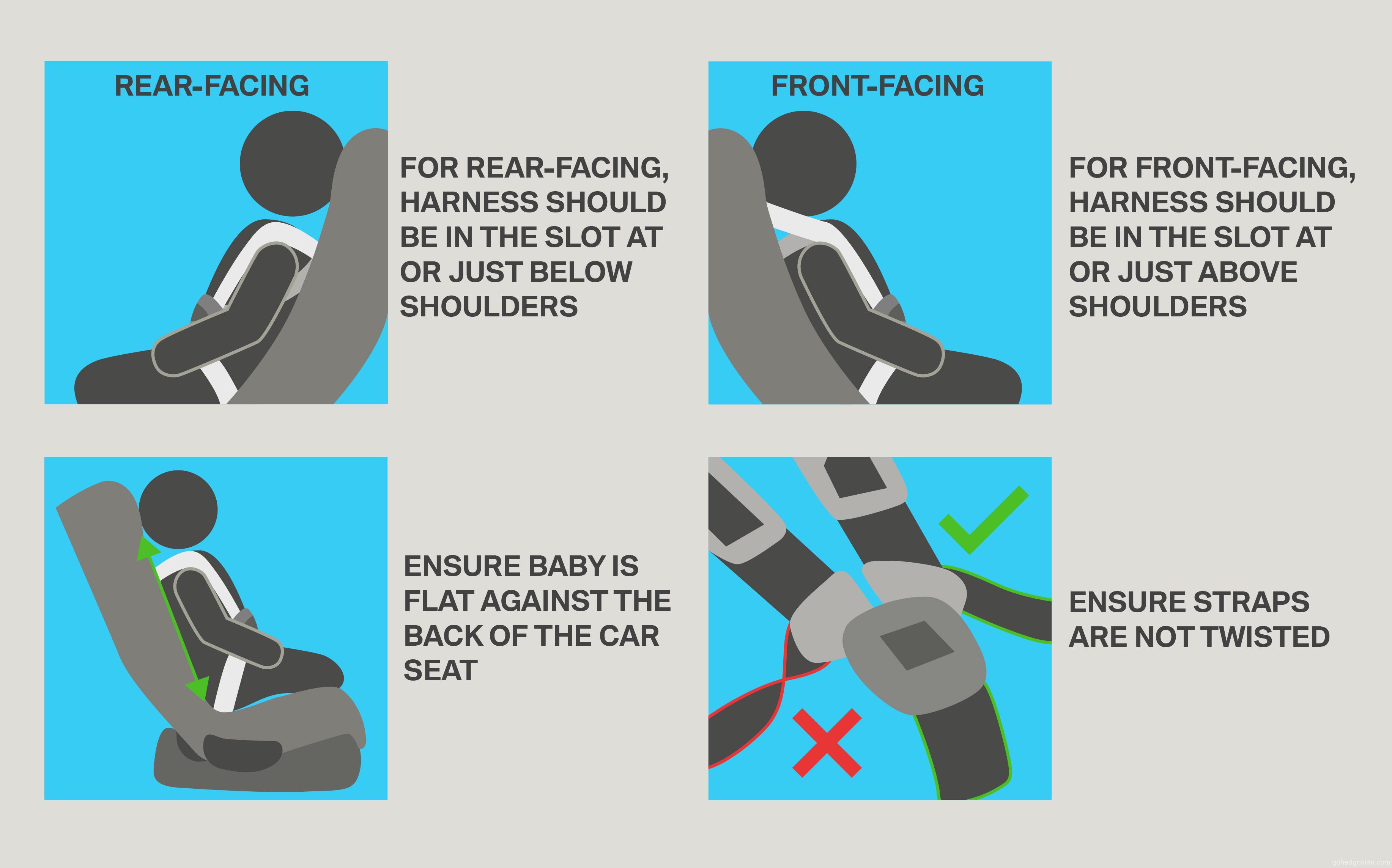 Selepas abah-abah kerusi tersebut dikenakan pada bayi, ibu bapa harus menjalankan ujian ‘dua jari’. Dua jari diselit di antara celah kabel abah-abah dan tulang selangka (collarbone) bayi, kemudian jari tersebut diputarkan pada sudut 90゚. Jika selitan dua jari ini dapat diputar, maka abah-abah tersebut masih longgar dan perlu diketatkan.