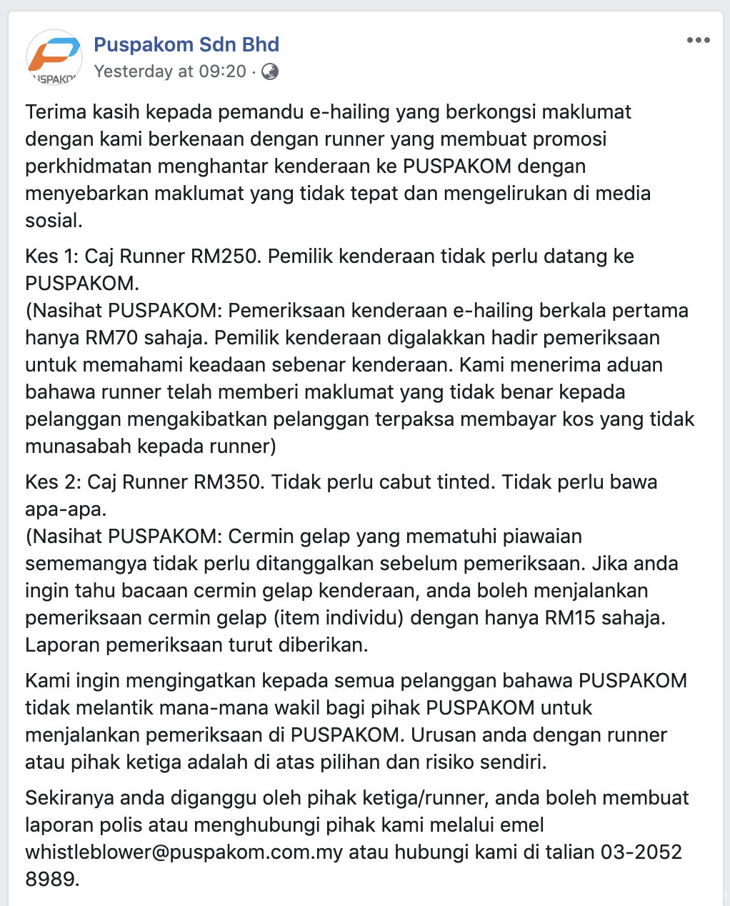 “Puspakom menggalakkan para pelanggan berurusan secara terus dengan pegawai kami. Sekiranya anda diganggu oleh pihak ketiga/runner, anda boleh membuat laporan polis atau menghubungi pihak kami melalui emel whistleblower@puspakom.com.my atau hubungi kami di talian 03-2052 8989.”