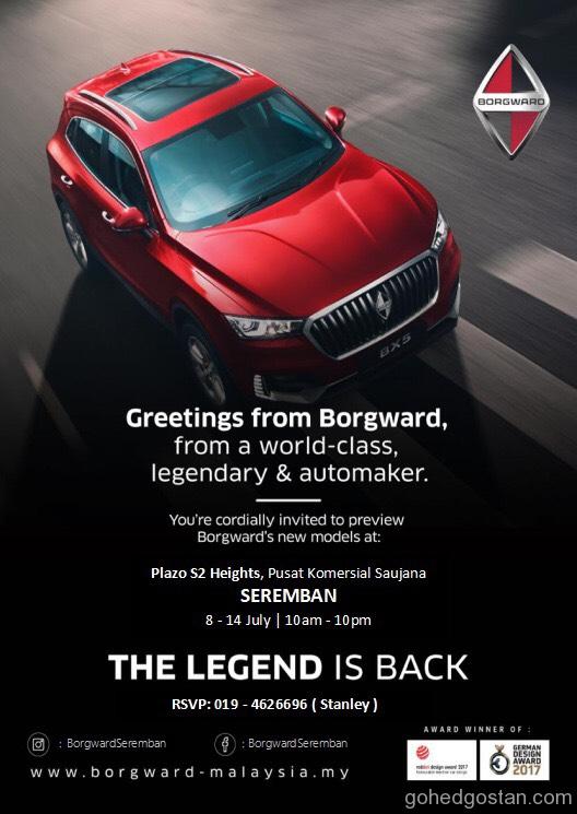 Bilik pameran di Glenmarie belum dibuka dan belum ada pengumuman rasmi kepada media, tetapi pemilik jenama di belakang nama Jerman tetapi milik Cina dan dibuat di China jenama kereta Borgward telah mempamerkan SUV mereka baru-baru ini di Juru.