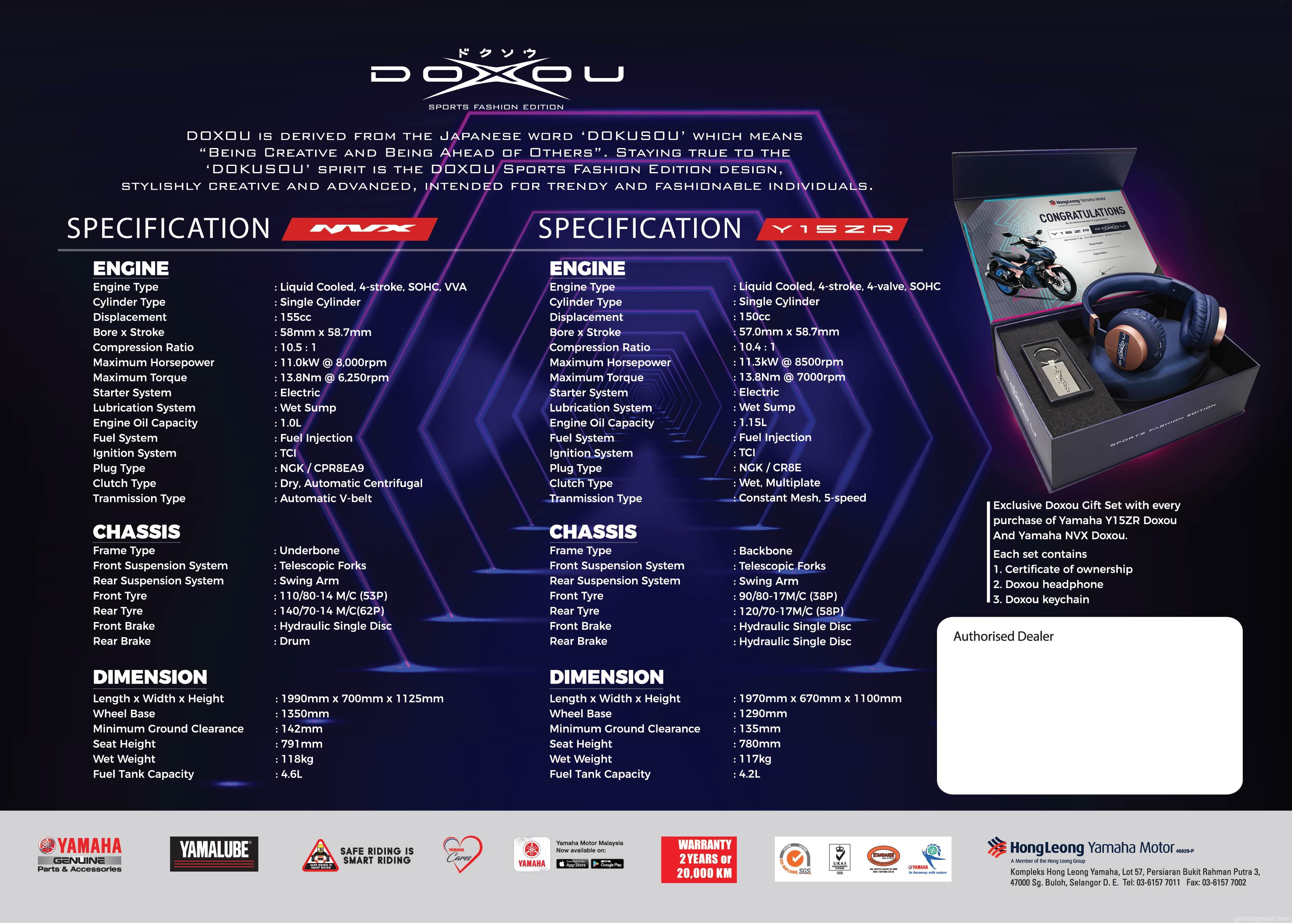 Apa yang menarik, setiap pembelian Y15ZR Doxou and NVX Doxou didatangkan dengan set hadiah eksklusif yang merangkumi fon kepala, rantai kunci dan sijil pemilikan lengkap dengan perincian enjin dan casis.