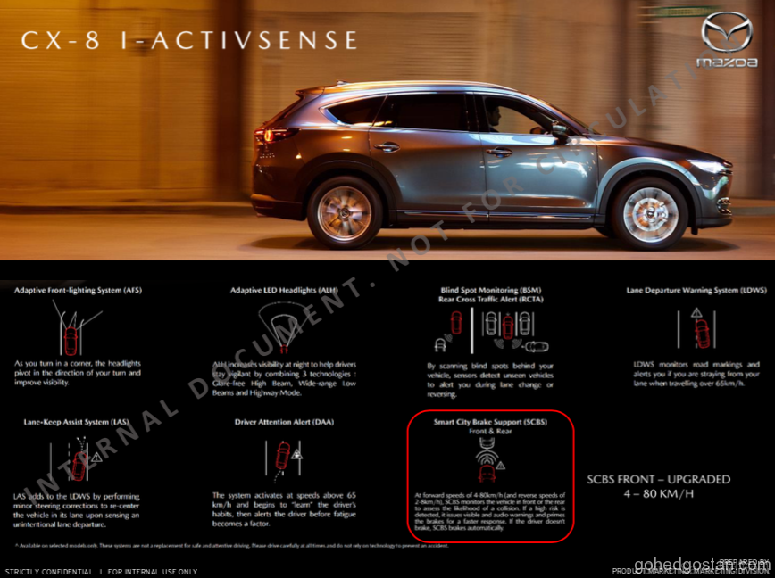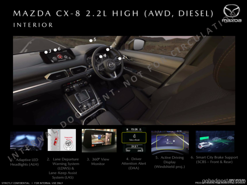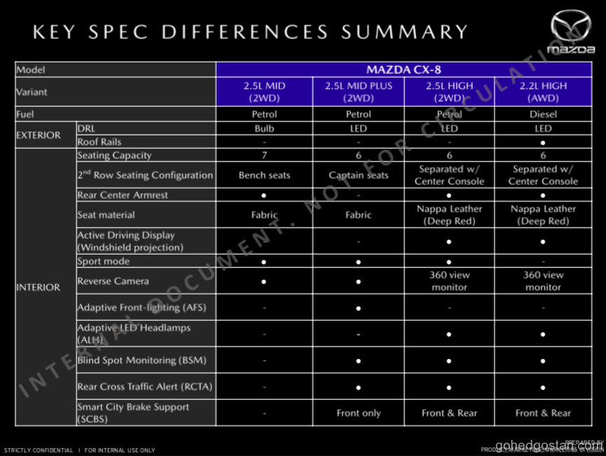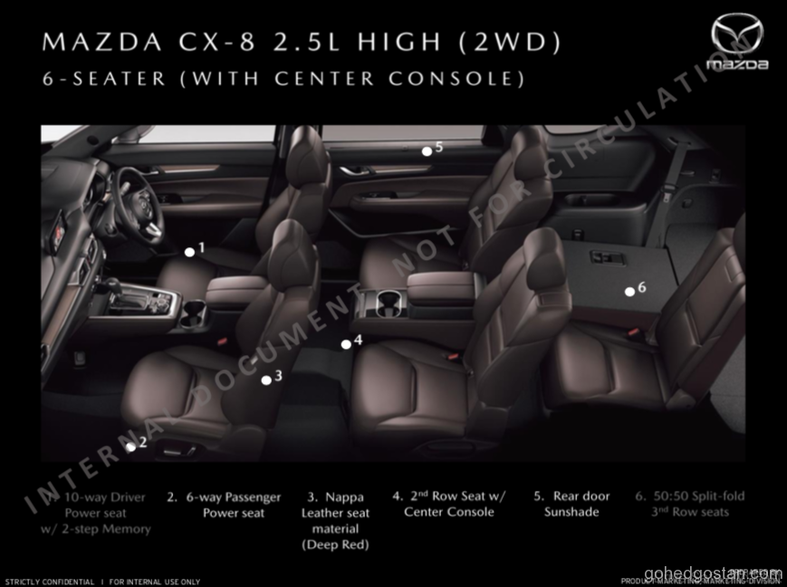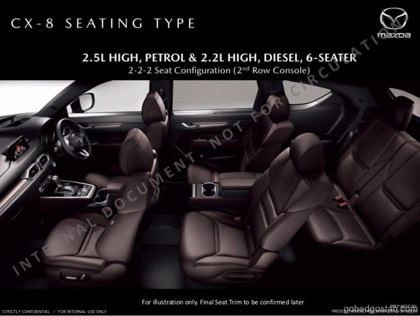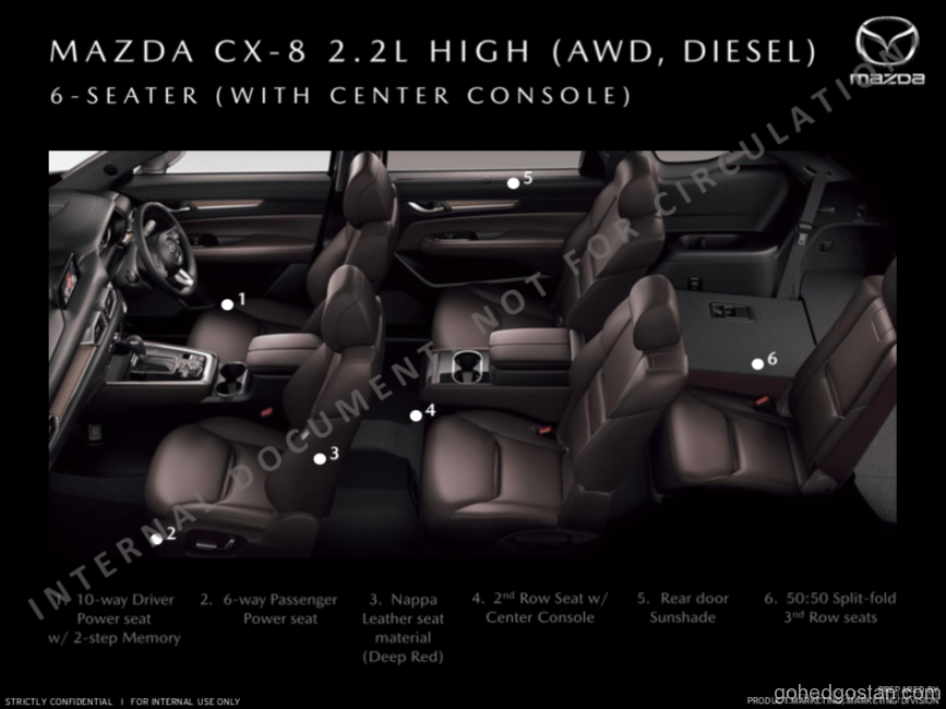 Kami mempunyai risalah CX-8 yang terbocor dan anggaran harga jualan, untuk kesemua 4 varian, termasuk versi diesel Skyactiv yang akan mempunyai pemacu semua roda dan konfigurasi 6 tempat duduk. Dengan anggaran RM222.000, diesel CX-8 ini akan bersaing secara langsung dengan 2 SUV diesel Korea yang mantap, Kia Sorento diesel pada RM185,888 dan Hyundai Santa Fe diesel yang dijual pada harga RM191,888.