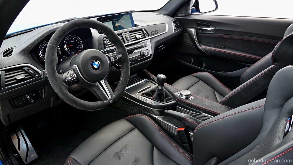 Masuk ke bahagian dalam, anda akan menjumpai konsol tengah gentian karbon, stereng M Sport serta tempat duduk M Sport yang diambil daripada M4 CS.