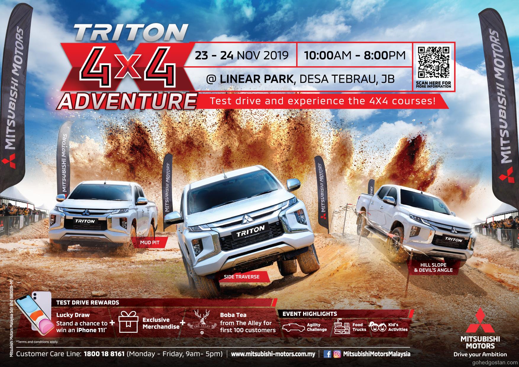 Mitsubishi Motors Malaysia (MMM) akan mengadakan acara Mitsubishi Triton 4×4 Adventure pada 23 dan 24 November ini di Linear Park, Desa Tebrau, Johor Bahru.