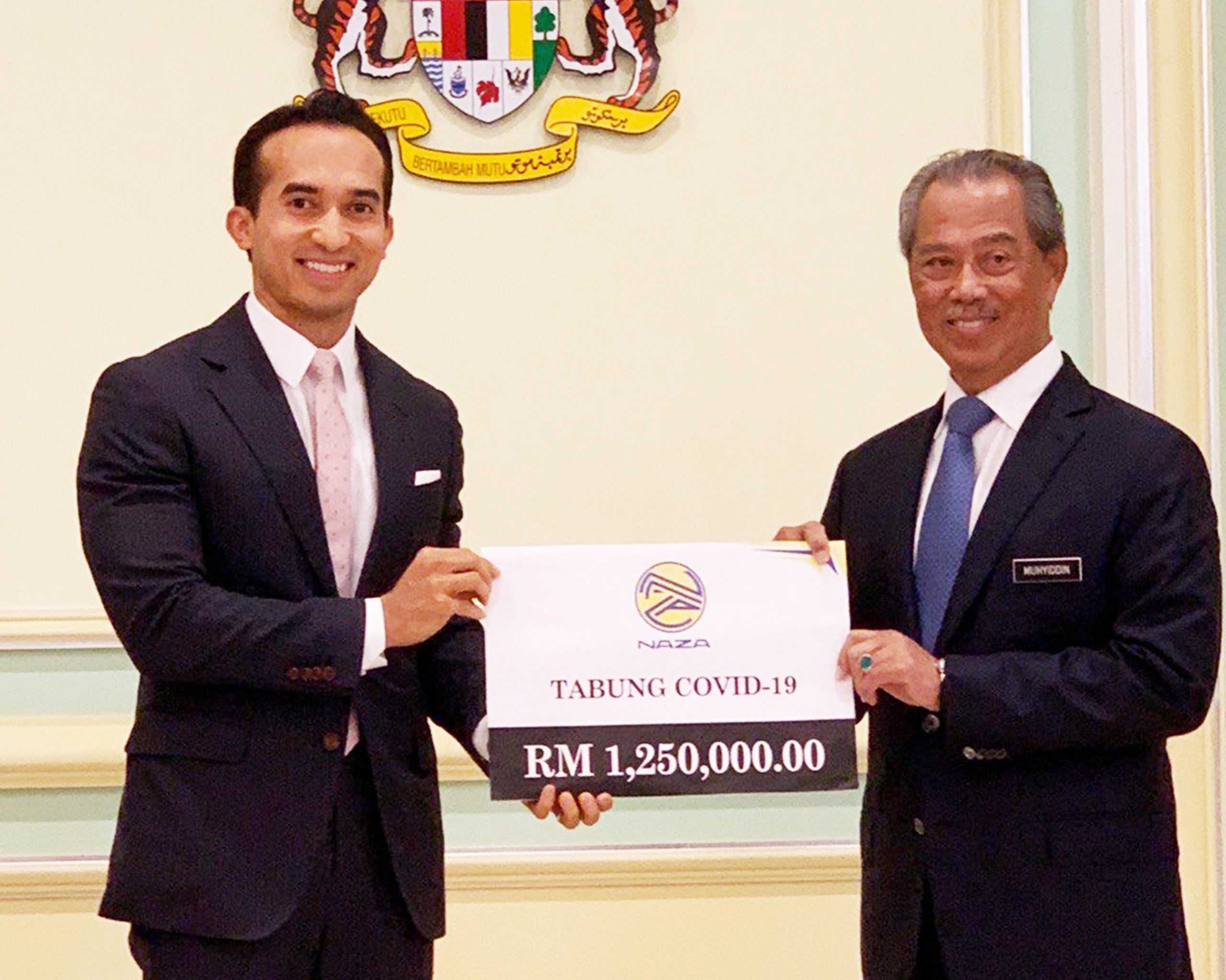 Cek sumbangan diserahkan kepada Perdana Menteri YAB Tan Sri Muhyiddin Yassin oleh Pengerusi Eksekutif Kumpulan dan Ketua Pegawai Eksekutif, Naza Corporation Holdings SM Nasarudin SM Nasimuddin.