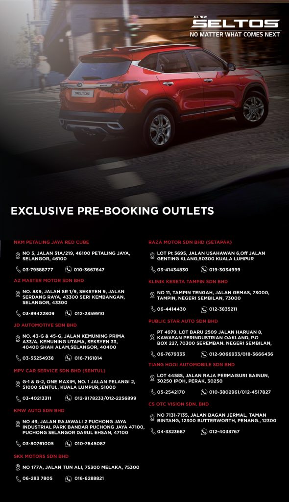 Naza Kia Malaysia mengumumkan tempahan untuk Kia Seltos telah mula dibuka di bilik pameran Kia terpilih. Pelancaran model ini dijangka dibuat pada Oktober hadapan.