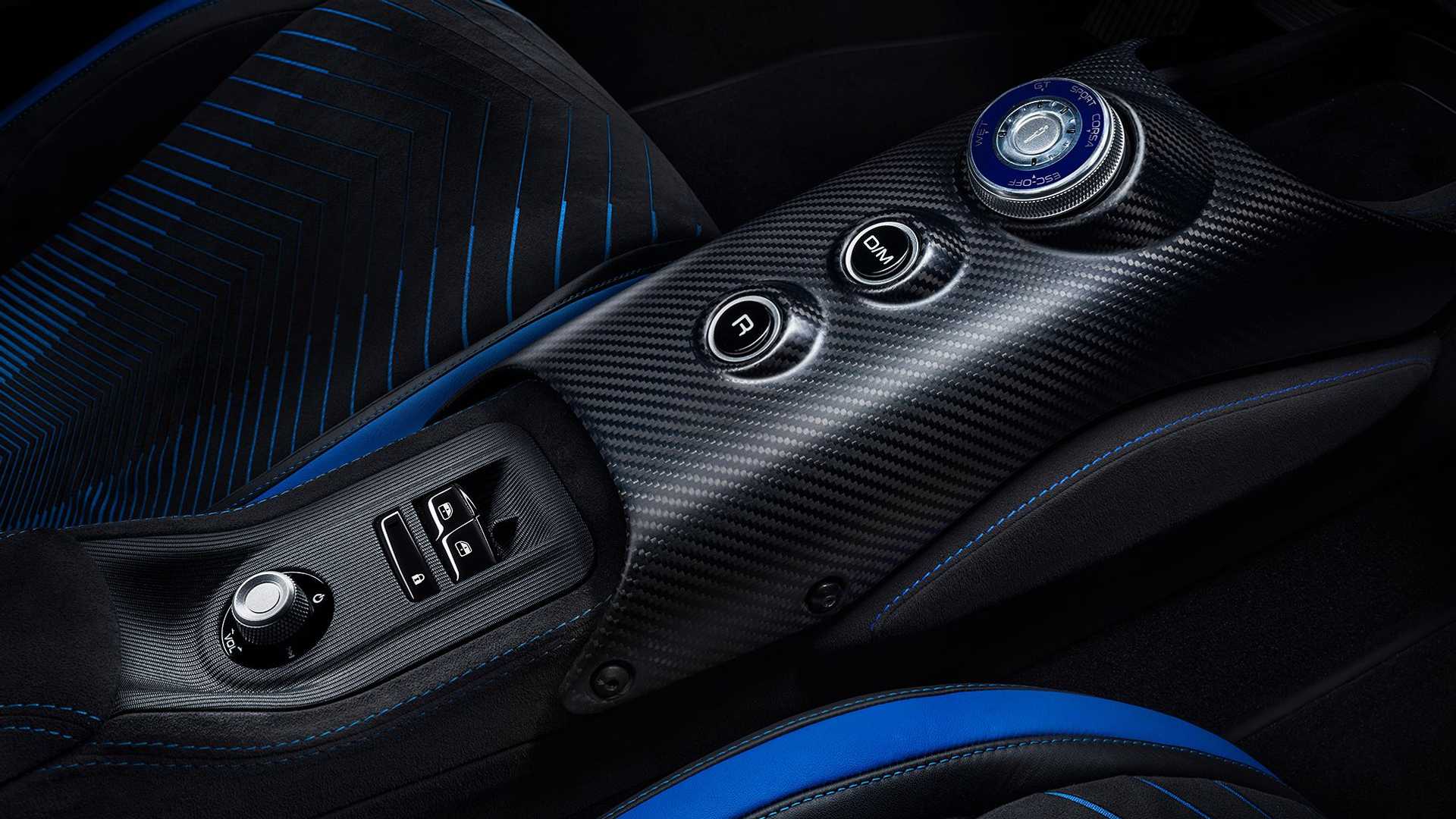 Konsol tengah tersebut diperbuat daripada gentian karbon dan hanya mengandungi beberapa kelengkapan seperti pengecas tanpa wayar, pemilih mod pemanduan, butang tingkap, butang kawalan sistem multimedia dan ruang penyimpanan di bawah perehat tangan. Butang kawalan yang lain diletakkan pada stereng, dengan butang penghidup enjin pada sebelah kiri dan Launch Control pada sebelah kanan.