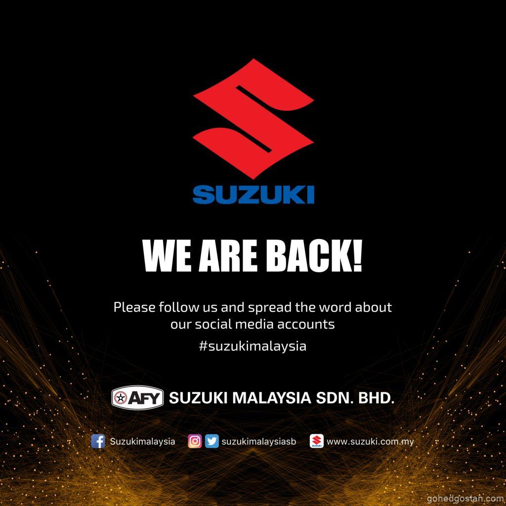 Suzuki Malaysia telah mengesahkan kepulanganya secara rasmi dengan pengumuman di laman Facebooknya. “Perhatikan media sosial kami untuk kemas kini dan berita menarik yang akan datang!” kata syarikat itu.