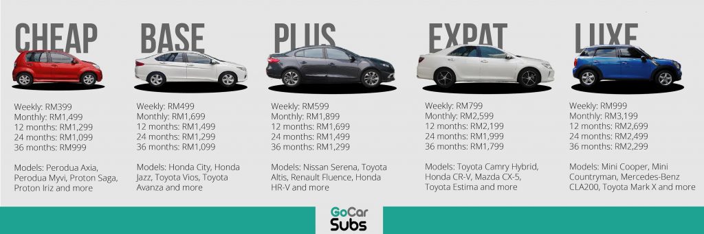 Menerusi struktur ini, rangkaian kenderaan GoCar Subs dibahagikan kepada lima kategori iaitu Cheap, Base, Plus, Expat dan Lux. Ia merangkumi jenama tempatan Perodua dan Proton sehinggalah jenama mewah seperti Mini, Mercedes-Benz serta banyak lagi.