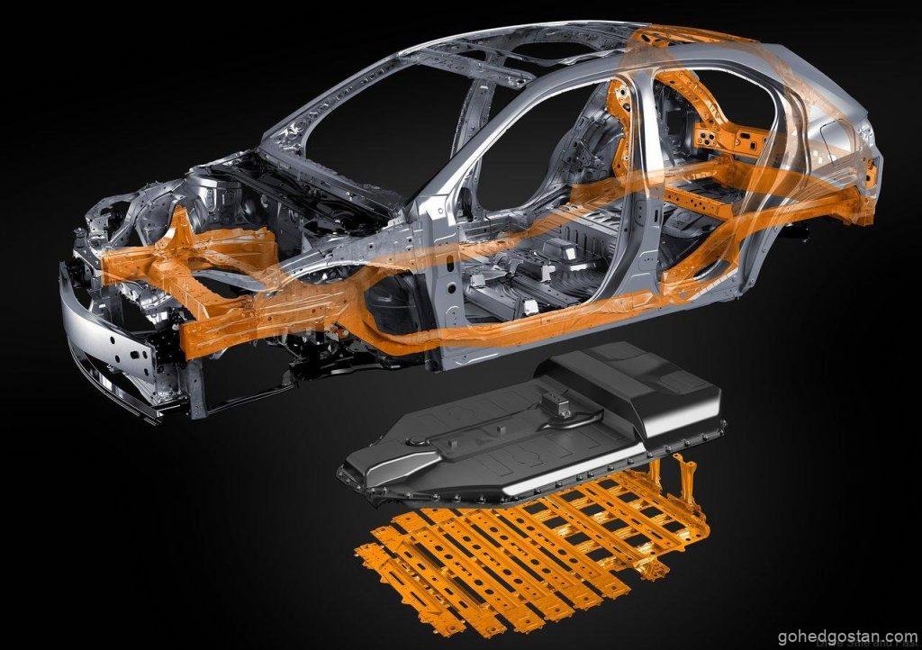 For class-leading steering precision and driving refinement, the high-performance level of the UX’s GA-C platform has been further enhanced by the extra rigidity of the UX 300e’s underfloor battery which is secured by cross members. An angular frame construction at the rear of the car and strengthened BEV transaxle mounting complete the UX 300e’s extremely rigid chassis.