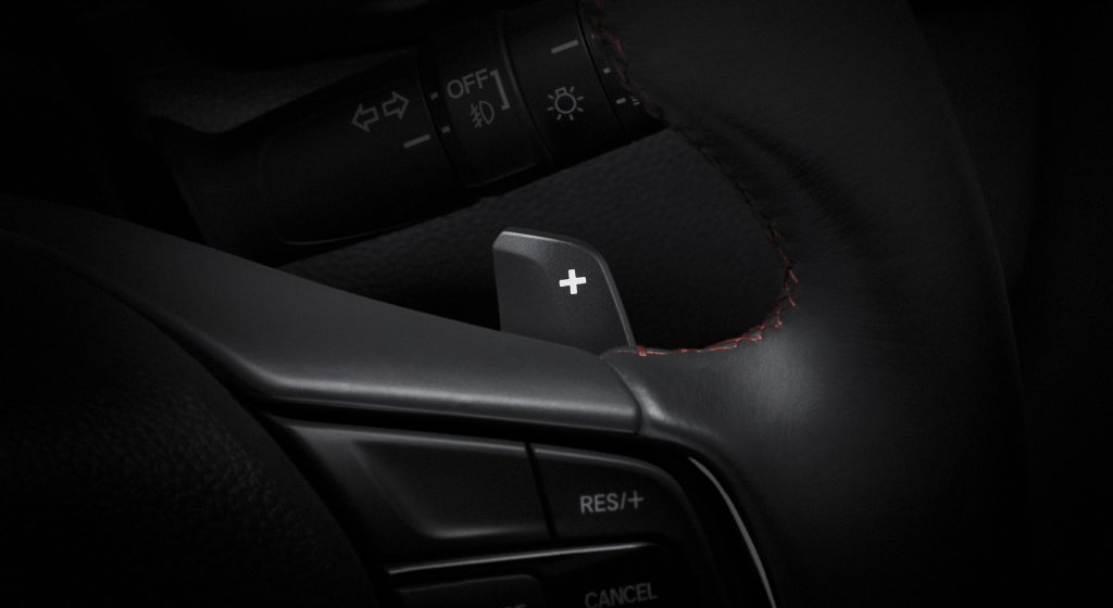 Sebagai varian teratas, City Hatchback RS mendapat ciri tambahan berupa upholsteri fabrik/suede/kulit sintetik dengan jahitan kontras merah, paddle shifter, Cruise Control, lapan pembesar suara dan Honda Connect.