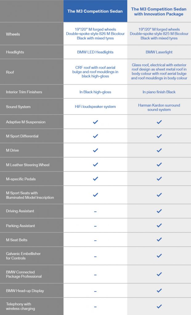 Untuk pasaran negara, kedua-dua M3 dan M4 hanya boleh didapati dalam versi Competition manakala Innovation Package ditawarkan secara opsyen. Untuk M3 Competition, harga jualan bermula dari RM664,800. Pelanggan yang memilih Innovation Package akan dikenakan bayaran tambahan sebanyak RM58,000.