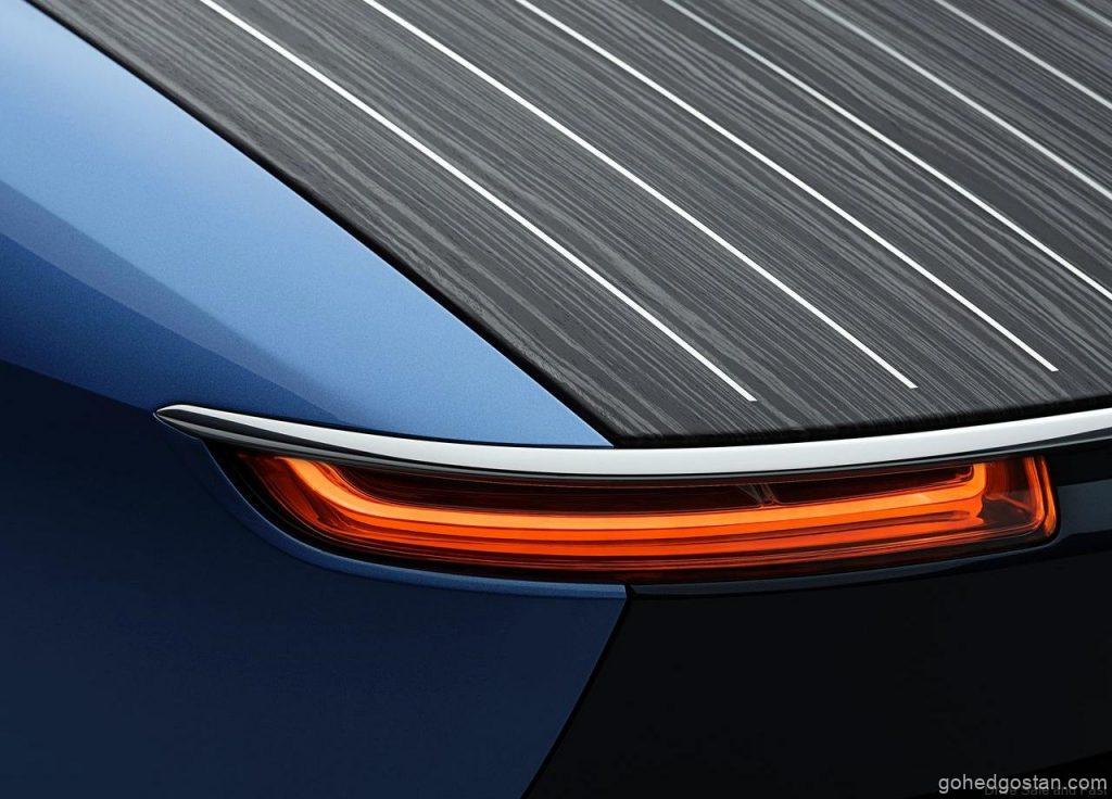 The open pore material features a linear wood grain which is visually elongated by brushed stainless steel pinstripe inlays, serving as an optical nod to the typical wooden construction of yachts – both old and new. The honed skills of Rolls-Royce’s wood specialists have manipulated and book-matched the grain so as to contract with the geometry of the car. The veneer treatment extends to the lower transom area resolving the taper and overall volume astern. This bold truncation is a subtle reference to the hull lines of classic Boat Tail bodies.