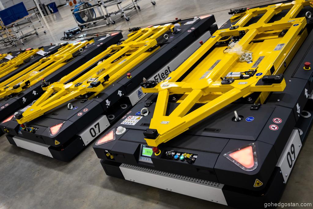 All-new Automatically Guided Vehicles (AGVs): AGVs allow for the highly efficient movement of cars in build on set routes around the factory, allowing operations colleagues to focus on assembling the vehicles. Routes are easily reprogrammed, creating a flexible and future-proof approach to Lotus sports car manufacturing. Each AGV has a height adjustment system so operators can position the car on it at exactly the right ergonomic height for them.