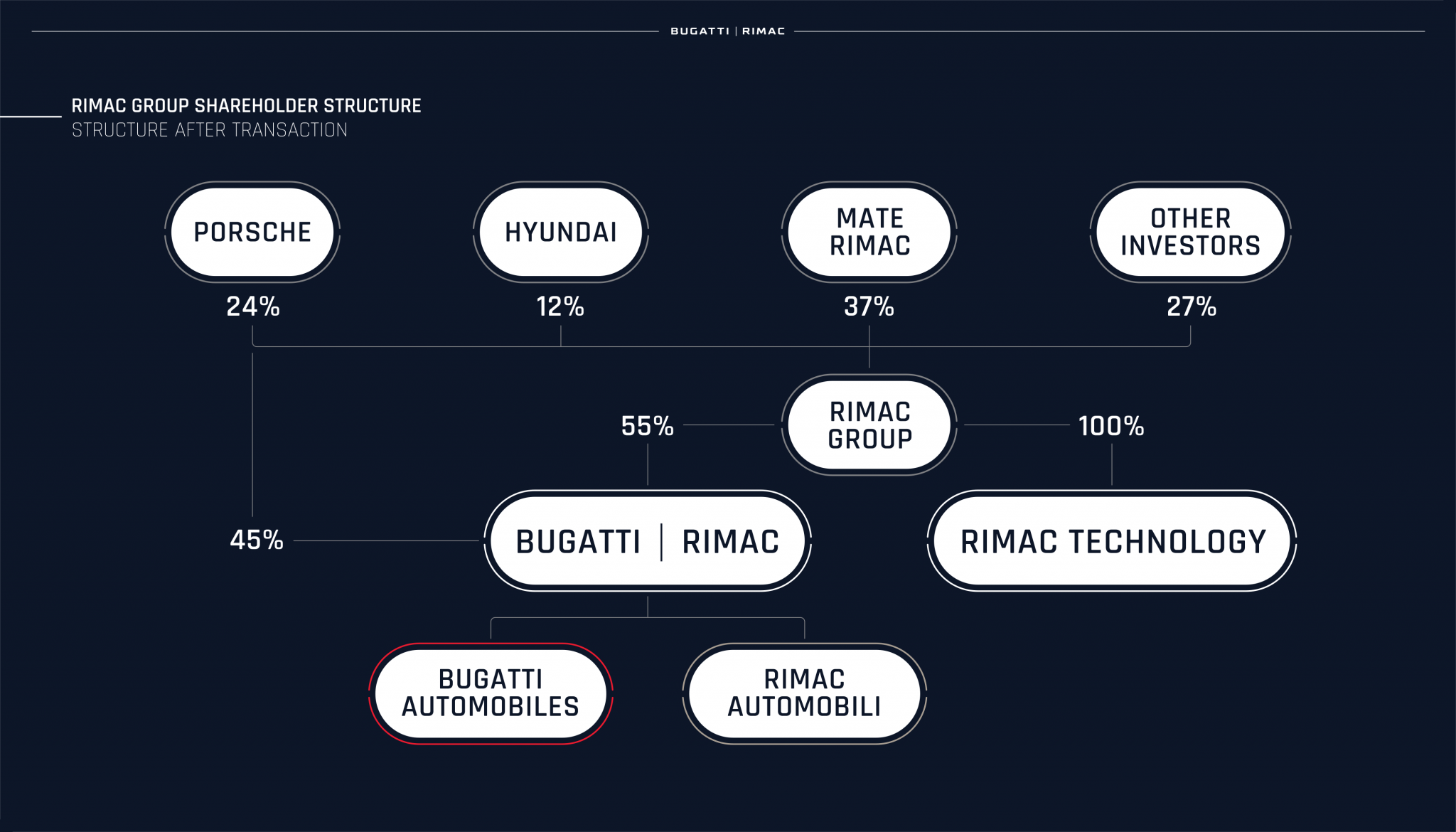 Dari segi struktur pemilikan, Rimac Group memegang 55 peratus saham dalam Bugatti-Rimac manakala 45 peratus lagi dipegang oleh Porsche. Pemilikan Rimac Group pula merangkumi pengasas syarikat iaitu Mate Rimac dengan pegangan saham terbesar iaitu 37 peratus, diikuti oleh Porsche (24 peratus), Hyundai (12 peratus) dan pelabur-pelabur lain (27 peratus).