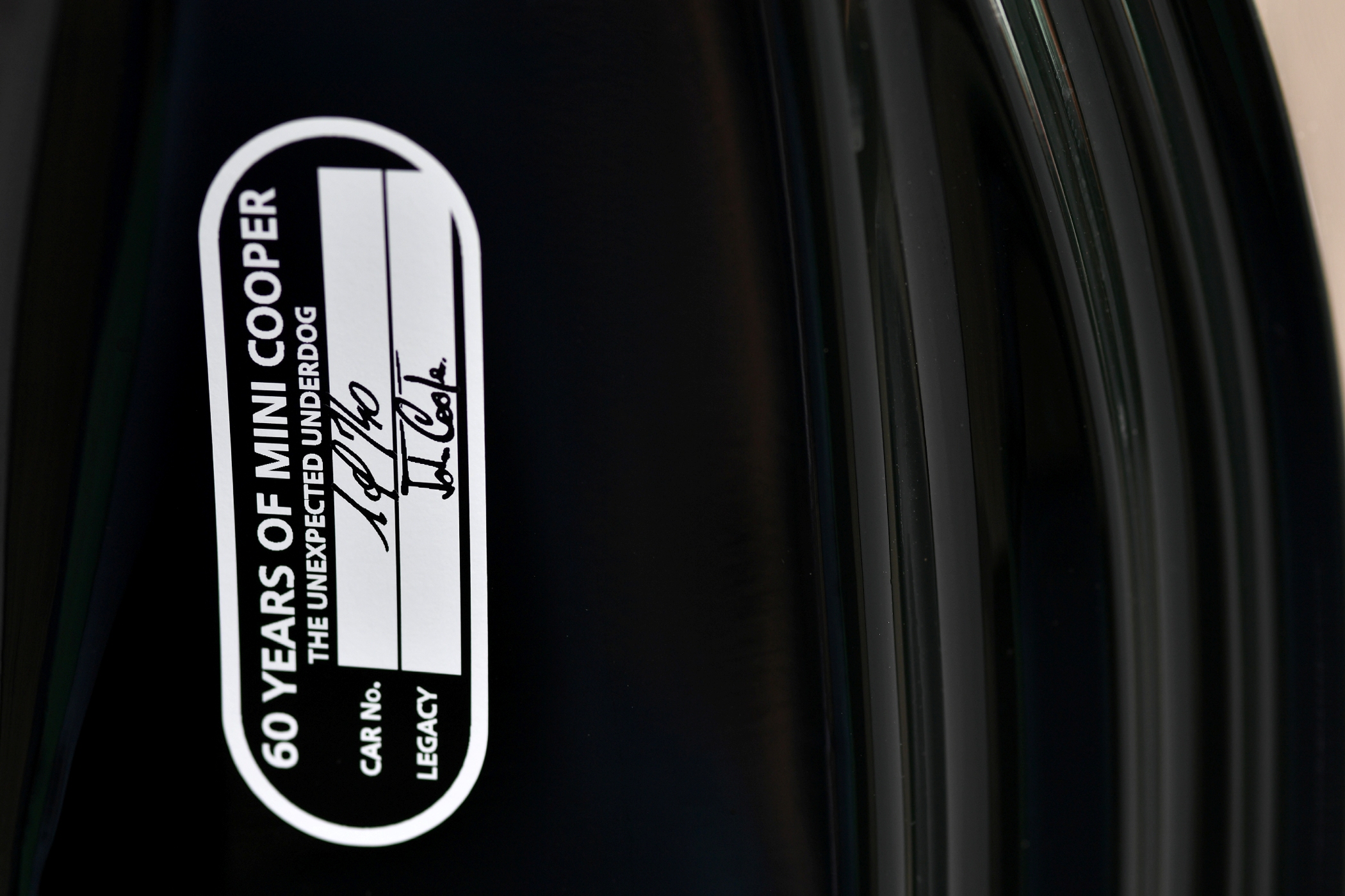 Di dalam, pelanggan akan menemui balutan kulit Nappa pada stereng, pelapik bumbung anthracite, tempat duduk sport John Cooper Works dengan balutan upholsteri Dinamica/kulit Carbon Black, set pedal keluli dan tandatangan John, Mike dan Charlie pada bahagian sebelah pemandu. Bukan itu sahaja, bingkai pintu sebelah pemandu juga menampilkan tandatangan John Cooper, serta nota “1 of 740” dan “60 Years of Mini Cooper – The Unexpected Underdog” yang ditulis dengan tangan.