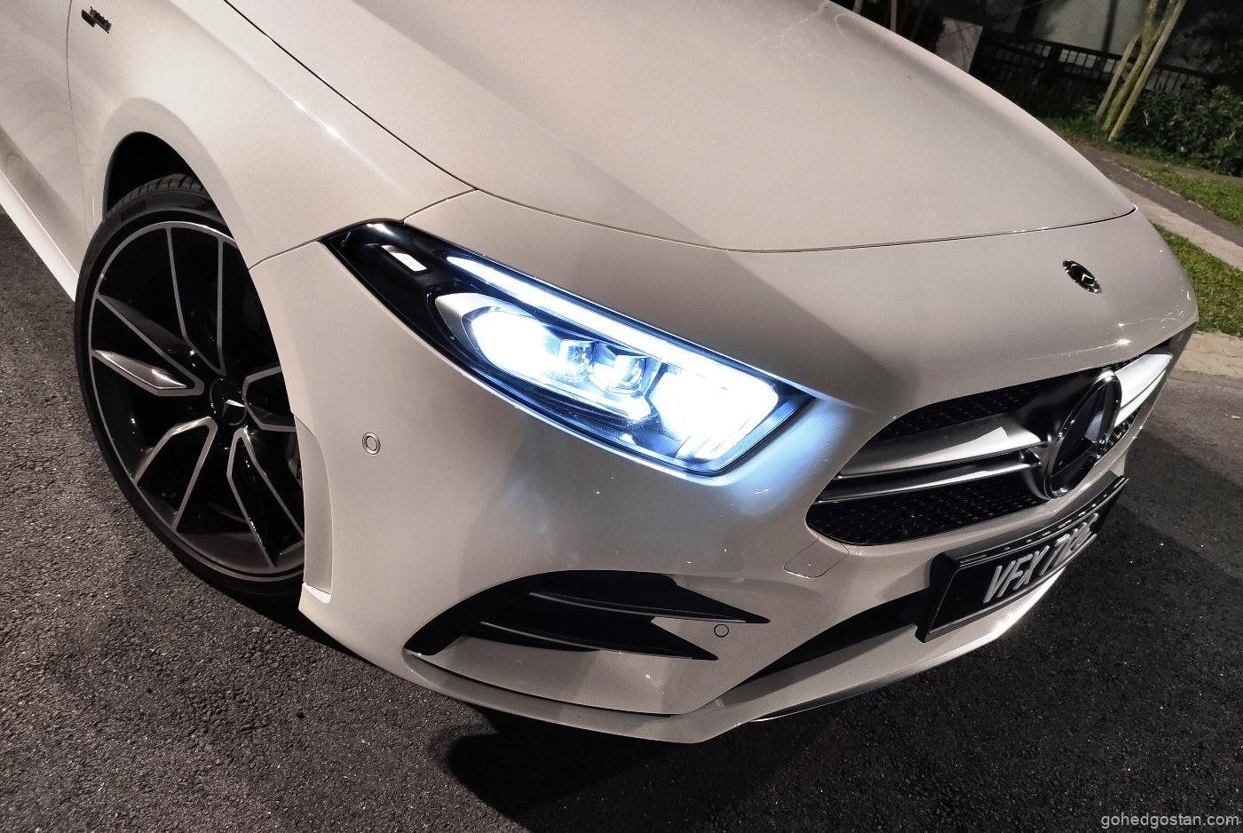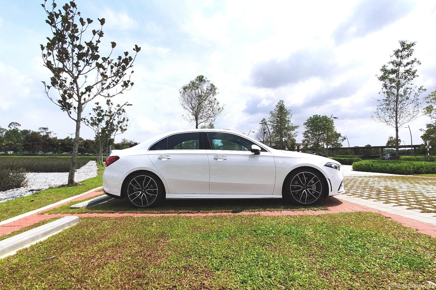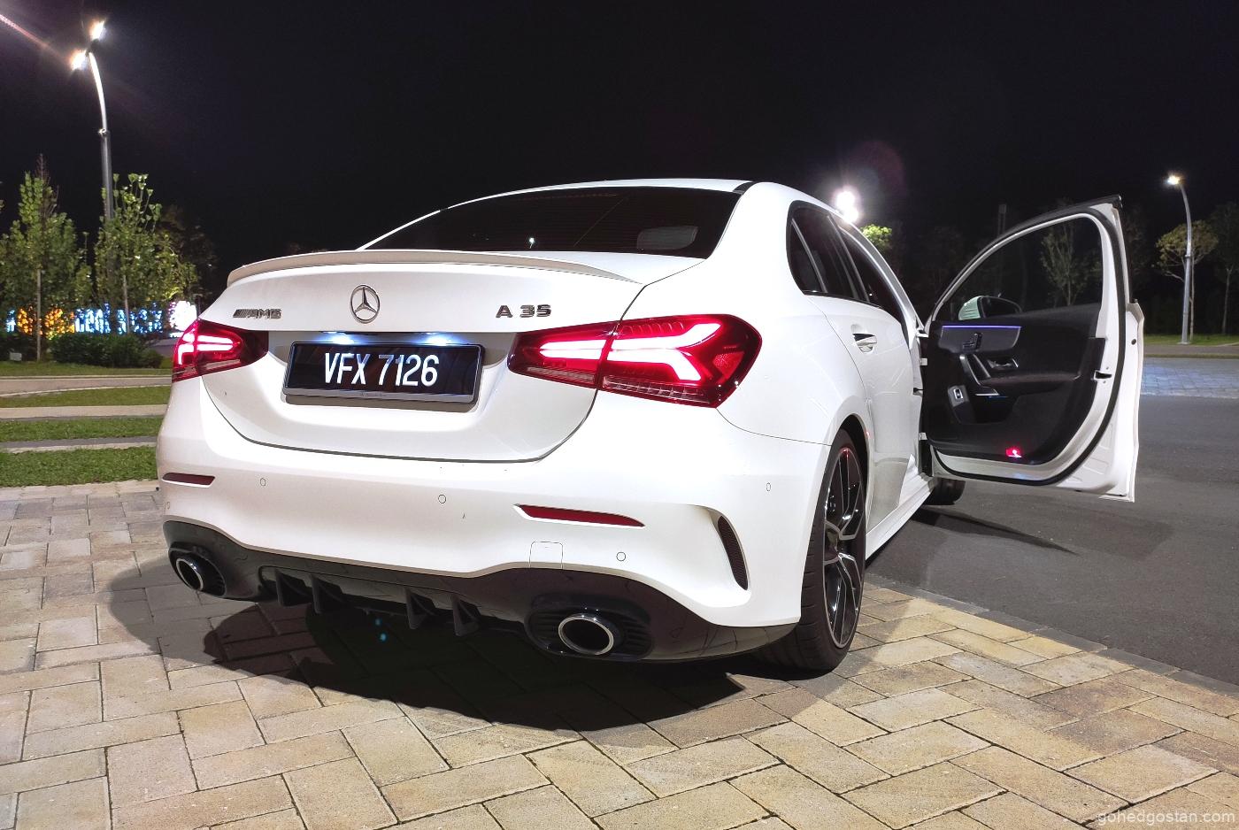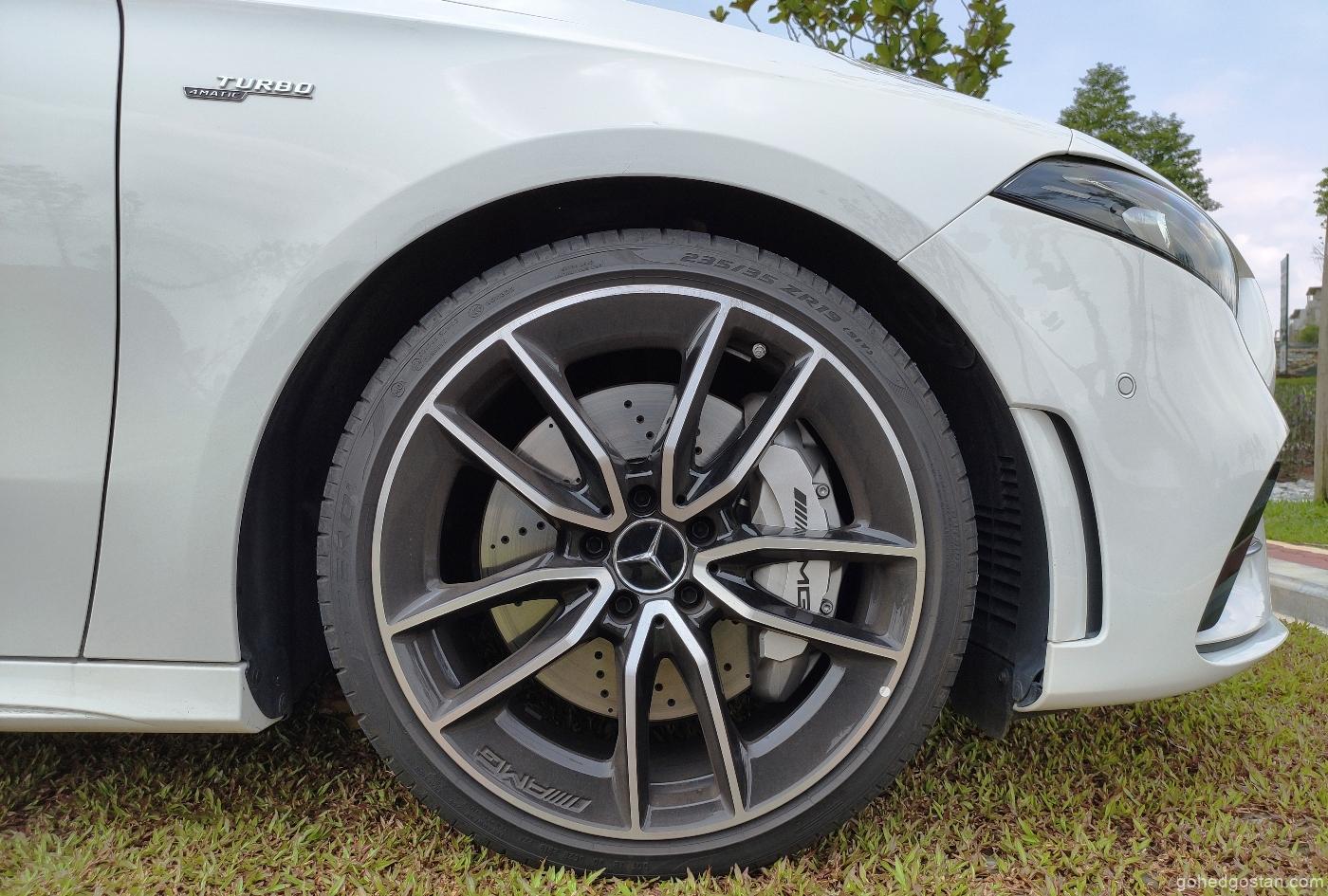 Bukan itu sahaja, model ini juga boleh dibezakan dengan rim aloi AMG bersaiz 19 inci. Untuk sebuah kereta yang memakai lencana AMG, penggayaan A35 boleh dikatakan agak sederhana dan tidak terlalu menonjol. Tiada canard pada bampar hadapan, spoiler yang tinggi mahupun pelekat sporty pada bahagian sisi badan, namun begitu ia masih mampu menarik perhatian.