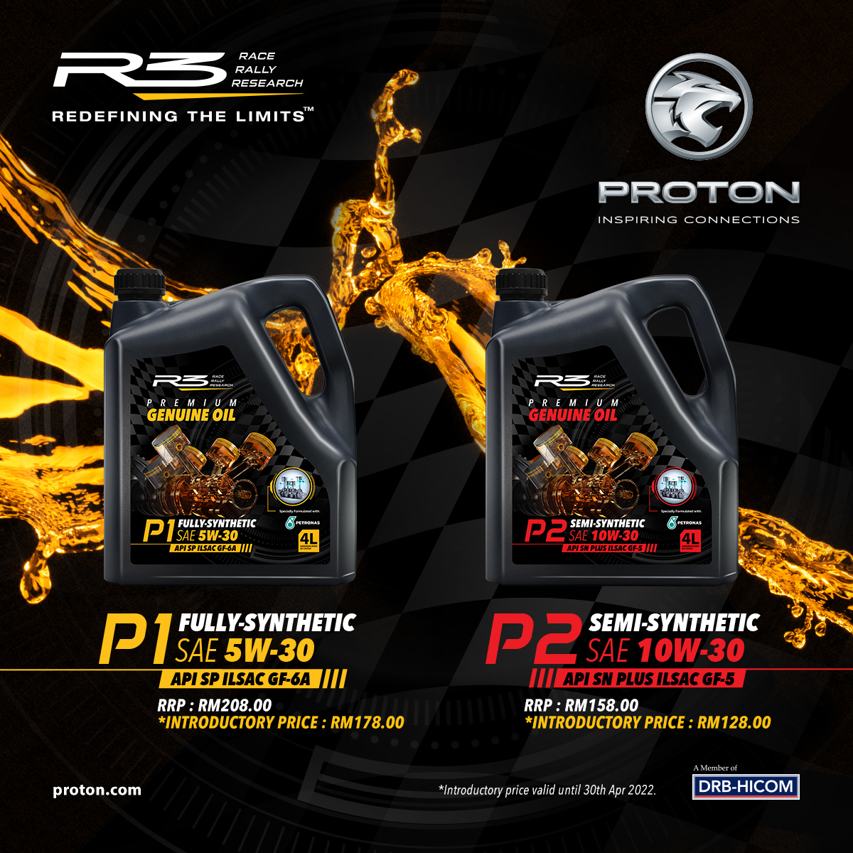 Dibangunkan dengan kerjasama Petronas, rangkaian minyak pelincir premium R3 boleh didapati dalam formulasi sintetik sepenuhnya P1 SAE 5W-30 dan separa sintetik P2 SAE 10W-30. Kedua-duanya memiliki penarafan SP dan SN Plus, serta pensijilan Institut Petroleum Amerika (API).