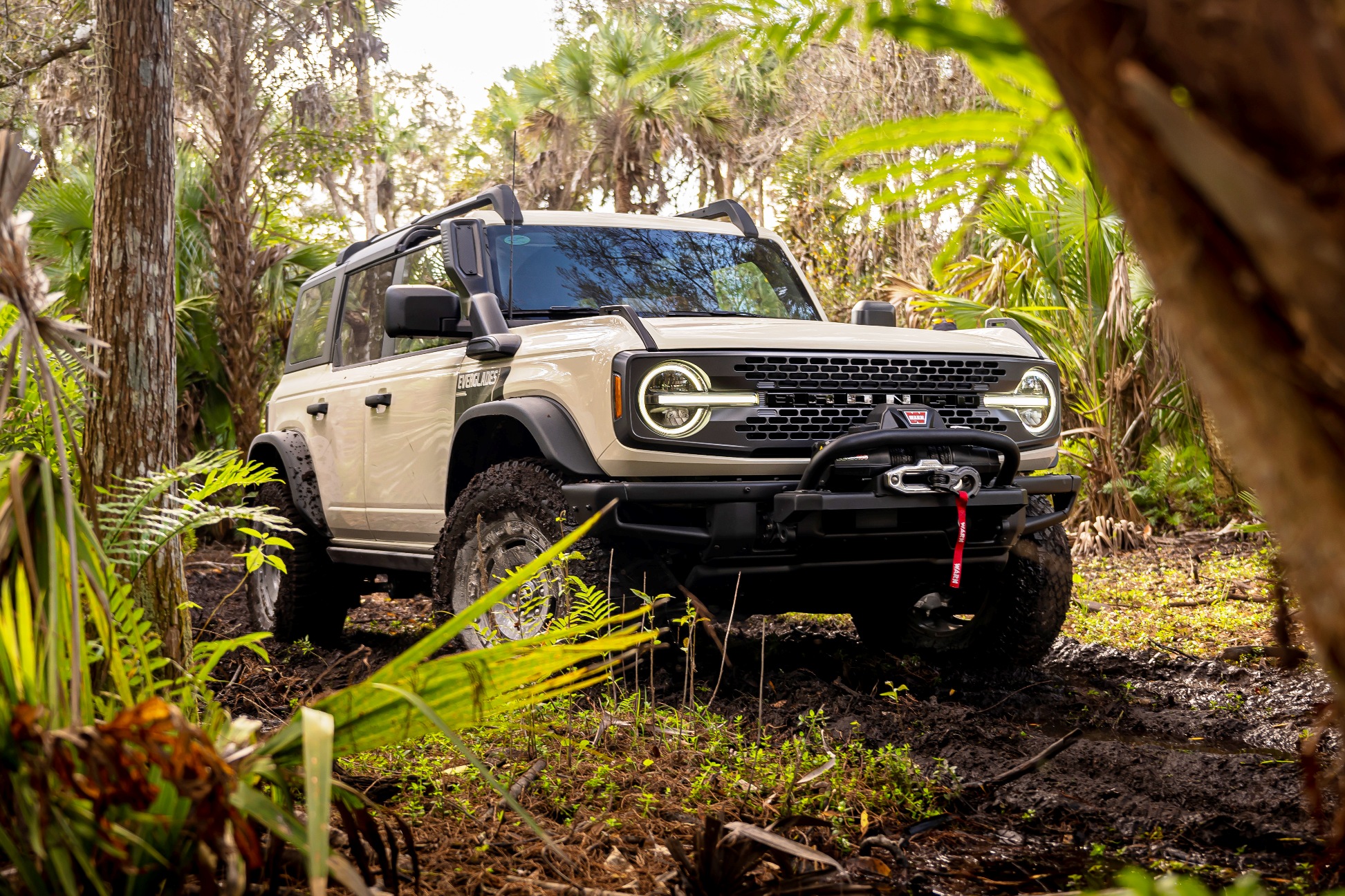 Hanya ditawarkan dalam versi empat pintu dengan bumbung hardtop, Bronco Everglades dilengkapi dengan snorkel pada tiang A serta rim Carbonized Grey 17 inci dan tayar lumpur 35 inci sebagai kelengkapan tambahan kepada pakej Sasquatch yang disertakan secara standard.