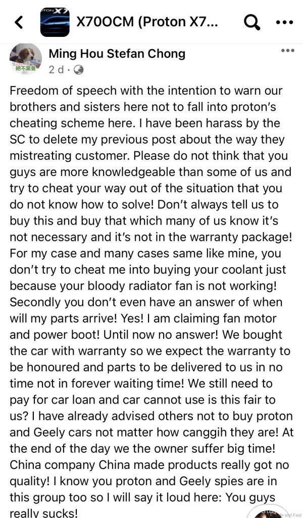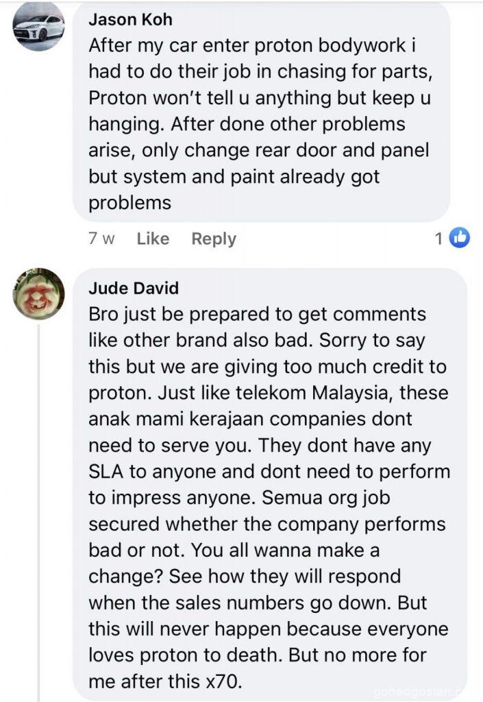 Jika anda layari pelbagai halaman pemilik Facebook Proton X70, anda akan melihat semakin ramai pemilik yang tidak berpuas hati dan isu-isu yang tidak masuk akal yang diketengahkan. Contohnya, untuk servis X70, TIADA minyak enjin. Apabila bateri kereta anda gagal, anda mesti menggunakan hanya bateri kereta Proton dan jenama lain tidak dibenarkan untuk mengelakkan kehilangan waranti anda. Kemalangan kecilan Proton X70 tidak boleh diperbaiki kerana TIDAK ada alat ganti bampar.