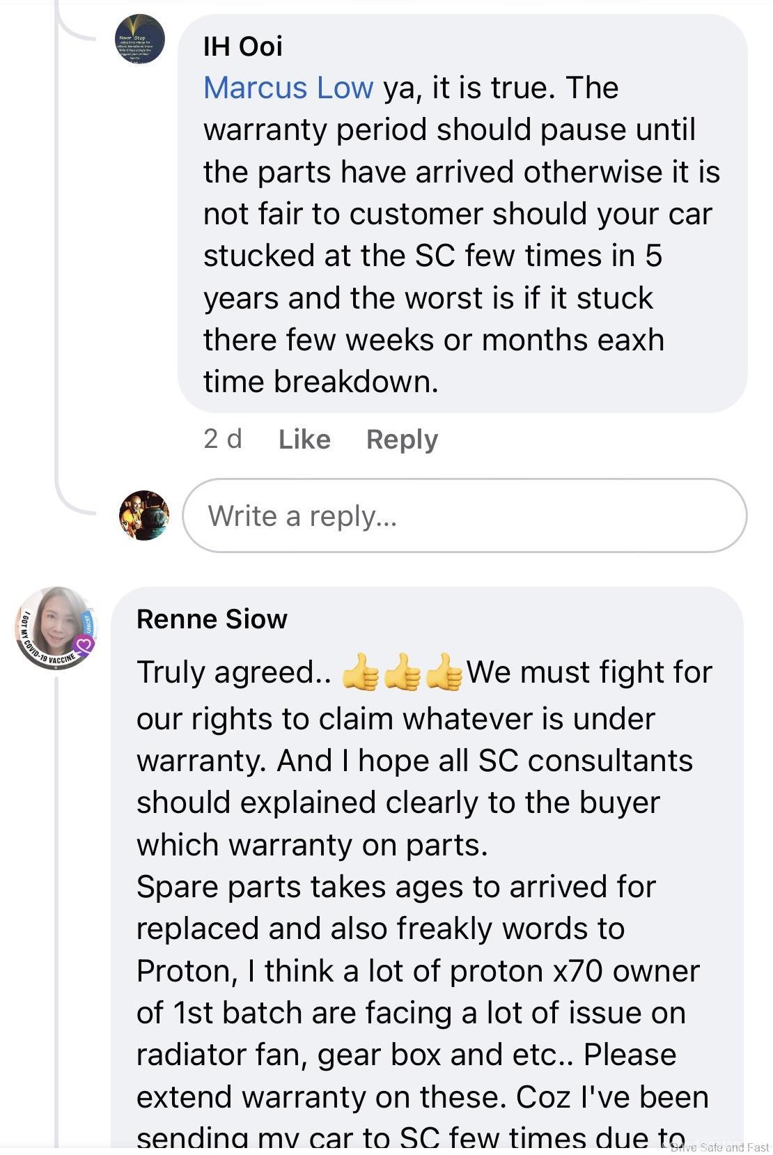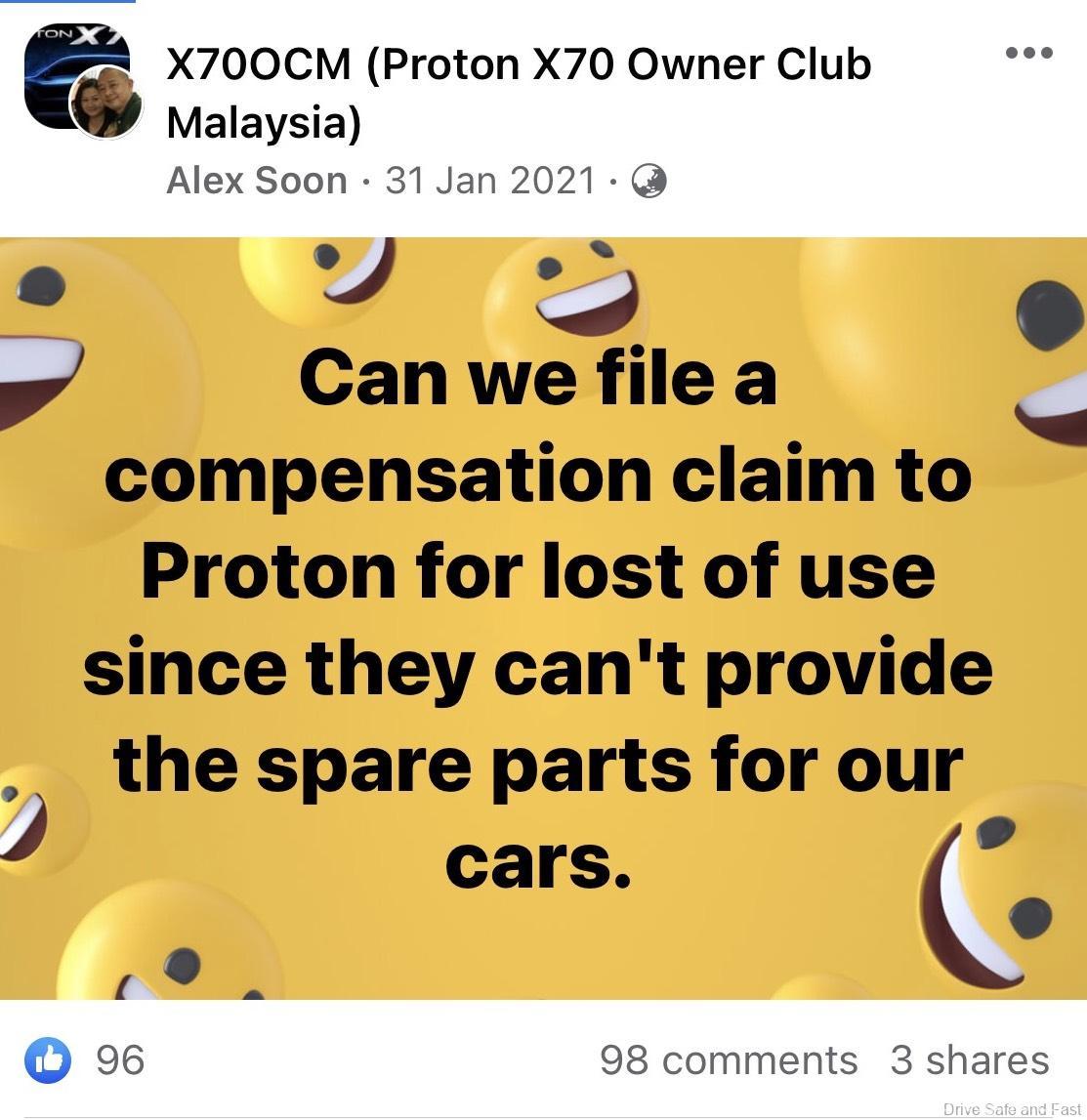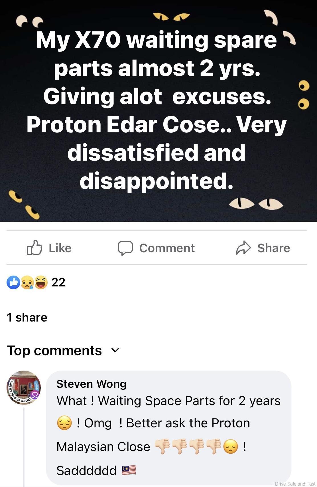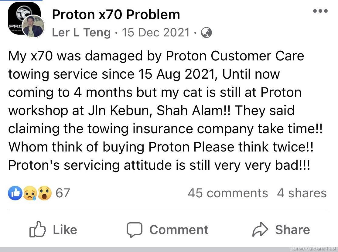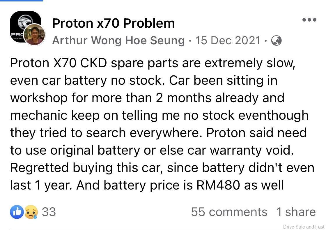 Jika anda layari pelbagai halaman pemilik Facebook Proton X70, anda akan melihat semakin ramai pemilik yang tidak berpuas hati dan isu-isu yang tidak masuk akal yang diketengahkan. Contohnya, untuk servis X70, TIADA minyak enjin. Apabila bateri kereta anda gagal, anda mesti menggunakan hanya bateri kereta Proton dan jenama lain tidak dibenarkan untuk mengelakkan kehilangan waranti anda. Kemalangan kecilan Proton X70 tidak boleh diperbaiki kerana TIDAK ada alat ganti bampar.