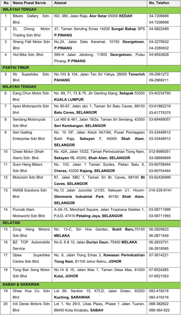 Bagi memenuhi keperluan pelanggan Kawasaki di seluruh negara, senarai pengedar yang sah akan sentiasa dikemas kini di laman web rasmi, https://www.kawasaki.com.my/home/. Untuk pertanyaan, pemilik motosikal Kawasaki boleh menghubungi Talian Bebas Tol Kawsaki di 1-800-880-008 atau WhatsApp Kawasaki Careline di +6019-570 8135.