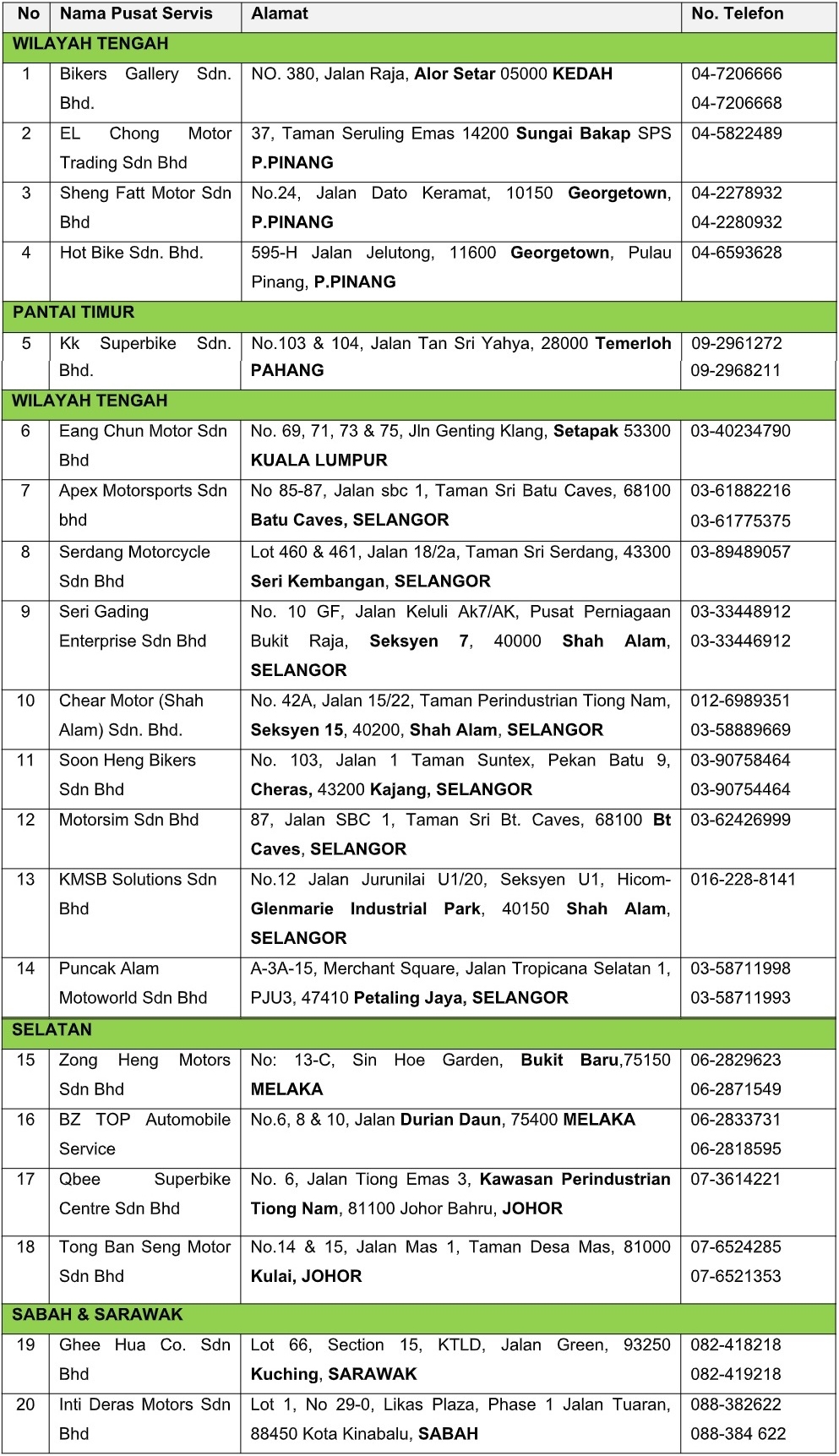 EMOS melalui wakil pusat servis, akan terus mengedar dan menyediakan perkhidmatan selepas jualan, alat ganti dan aksesori untuk model Kawasaki di Malaysia sehingga diberitahu kelak. Oleh yang demikian, pertanyaan berkenaan alat ganti dan perkhidmatan teknikal termasuk panggilan semula (recall) boleh dirujuk di wakil pusat servis Kawasaki yang sah seperti yang disenaraikan di bawah.