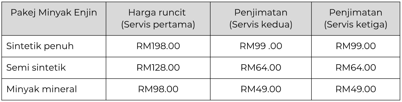 Kemudian, mereka akan menikmati penjimatan sebanyak 50% ke atas pakej minyak enjin yang sama pada servis kedua dan ketiga. Mereka yang ingin menaik taraf pakej minyak enjin atau membeli produk-produk dan perkhidmatan lain hanya perlu menambah perbezaan harganya.