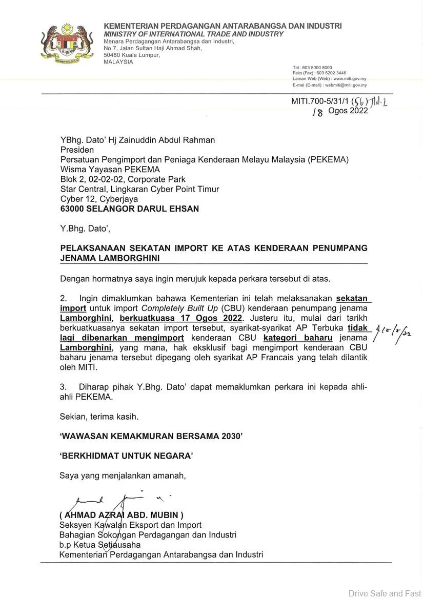 PEKEMA dan kerajaan sekali lagi dalam liputan. Kali ini, Kementerian Perdagangan Dan Industri/Ministry Of International Trade And Industry (MITI) mengarahkan PEKEMA (Persatuan Pengimport dan Peniaga Kenderaan Melayu Malaysia) menghentikan pengimportan Lamborghini. Ini menurut surat yang dikeluarkan pada 18 Ogos 2022.