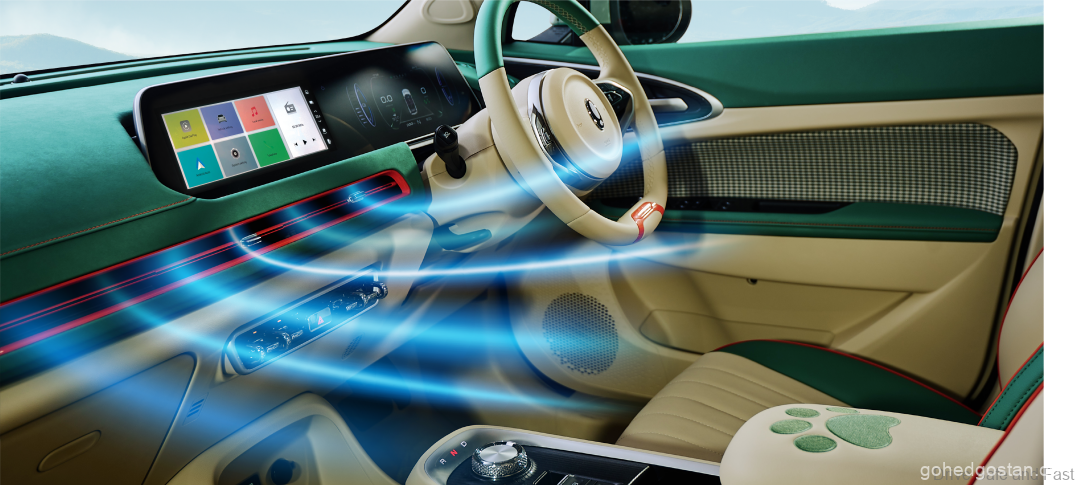 Selain dari warna luar yang mencuri perhatian, interior Ora Good Cat juga mengalami penyegaran yang serasi. Kombinasi warna hijau pistachio dan beige pada bahagian dalam memberikan kesan yang menenangkan dan elegan. Anda juga akan terpesona dengan rekaan sandaran tangan yang menggemaskan berbentuk jejak kaki kucing. Ventilasi udara berwarna oren cerah dan stereng berwarna hijau pistachio dan beige melengkapkan suasana interior yang menyegarkan ini.