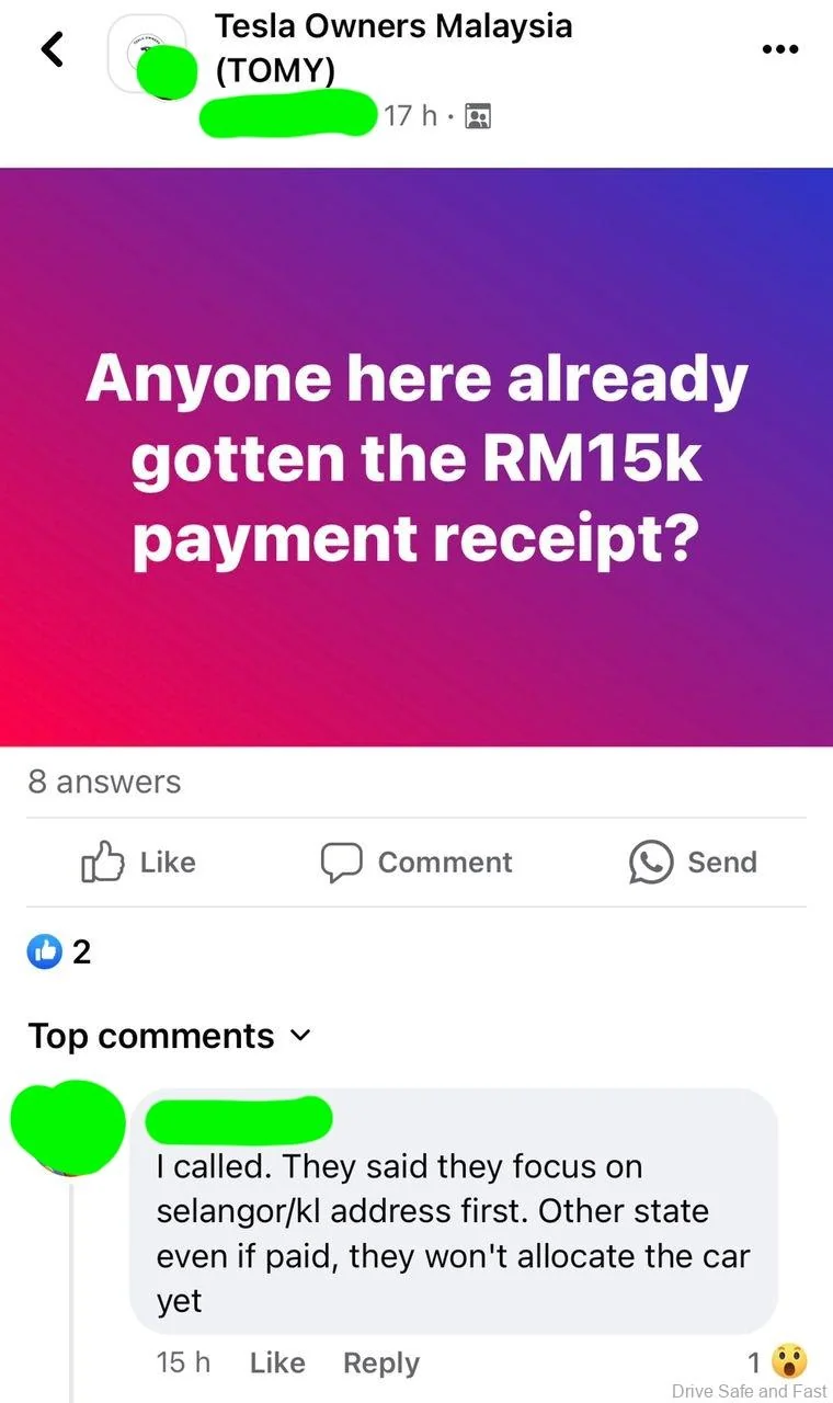 Minggu ini, situasi ini telah dibawa kepada perhatian kami oleh ahli-ahli kumpulan Facebook Tesla Owners Malaysia (TOMY). Seorang ahli telah bertanya kepada kumpulan ini sama ada sesiapa yang telah menerima resit untuk pembayaran RM15K tersebut. Nampaknya beberapa ahli telah membayar RM15K, tetapi belum menerima pengesahan rasmi pembayaran. Seorang ahli telah membayar pada 21 September dan masih belum mendapat pengiktirafan rasmi pembayaran.