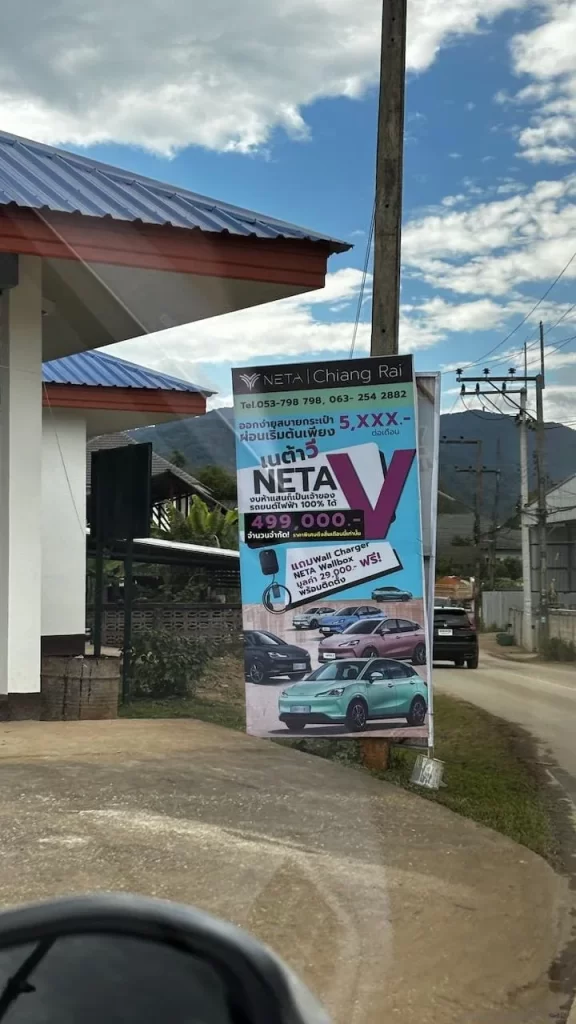 Semasa kami berada di Thailand Utara baru-baru ini, kami melihat beberapa unit Neta V EV dan turut menemui beberapa bunting yang memaparkan harga. Neta V dijual pada harga 499,000 BHT, kira-kira RM66,000! Tambahan pula, promosi ini termasuk pemberian pengecas AC rumah bernilai kira-kira RM4,000. Tidak hairanlah Neta telah menjual lebih dari 10,500 kenderaan di Thailand dalam tempoh sepuluh bulan pertama operasi, sebelum kilang ini dibuka. Sasaran jualan mereka adalah 13,000 kenderaan di Thailand menjelang akhir tahun 2023.