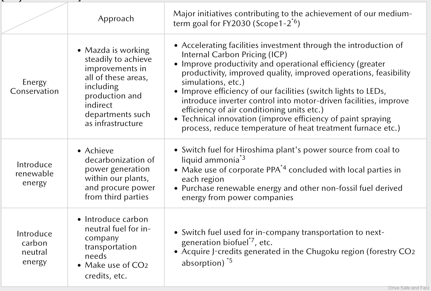 - Pengenalan Bahan Api Netral Karbon Mazda membuat perubahan strategik dalam bahan api yang digunakan untuk pengangkutan dalaman, daripada diesel kepada bahan api bio generasi seterusnya. Di mana sumber bahan api alternatif untuk penghasilan tenaga sukar diperolehi, syarikat ini akan menggunakan J-kredit untuk menyokong pemeliharaan hutan dan penanaman semula pohon, yang menyumbang kepada penyerapan CO2 di pelbagai kawasan.