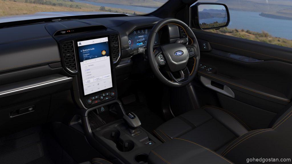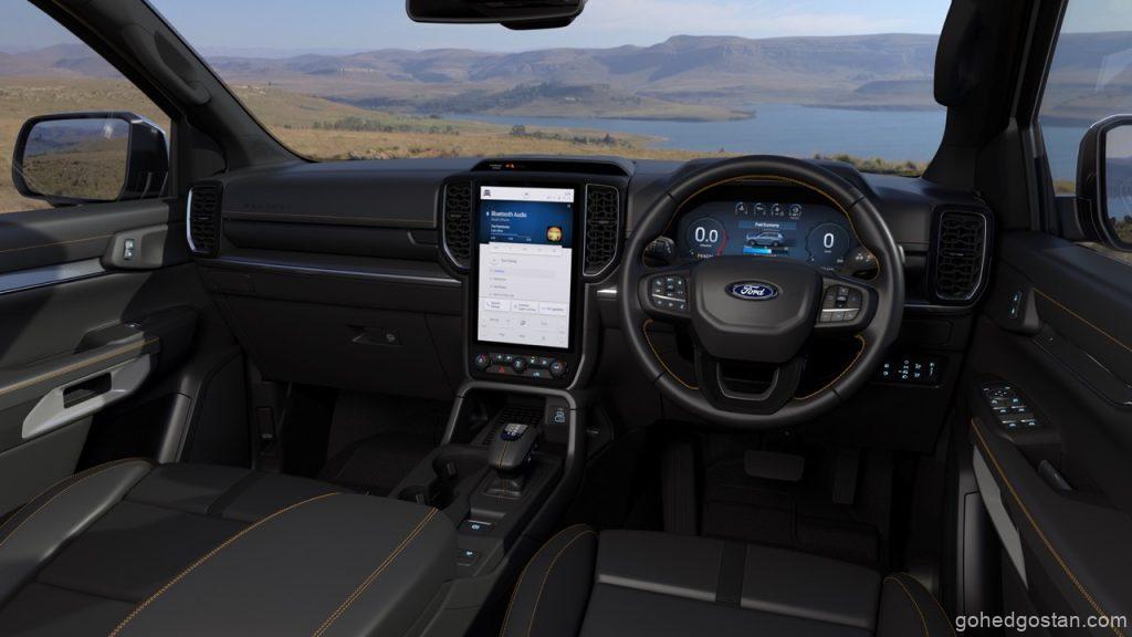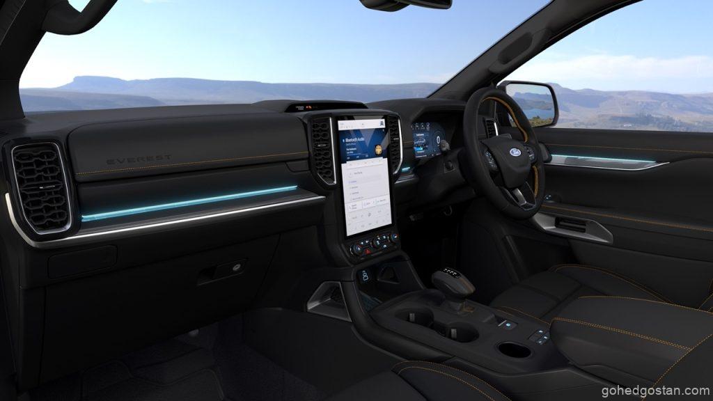 Apabila memasuki kabin Ford Everest WildTrak Edisi Khas, anda akan disambut dengan kerusi kulit sintetik hitam yang elegan, dihiasi dengan jahitan oren dan logo ‘WildTrak’, mencipta suasana kemewahan dan keselesaan yang tak tertandingi.