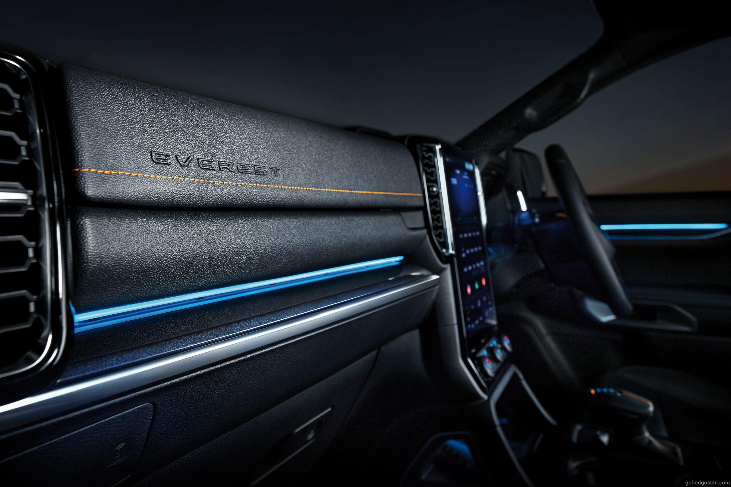 Apabila memasuki kabin Ford Everest WildTrak Edisi Khas, anda akan disambut dengan kerusi kulit sintetik hitam yang elegan, dihiasi dengan jahitan oren dan logo ‘WildTrak’, mencipta suasana kemewahan dan keselesaan yang tak tertandingi.