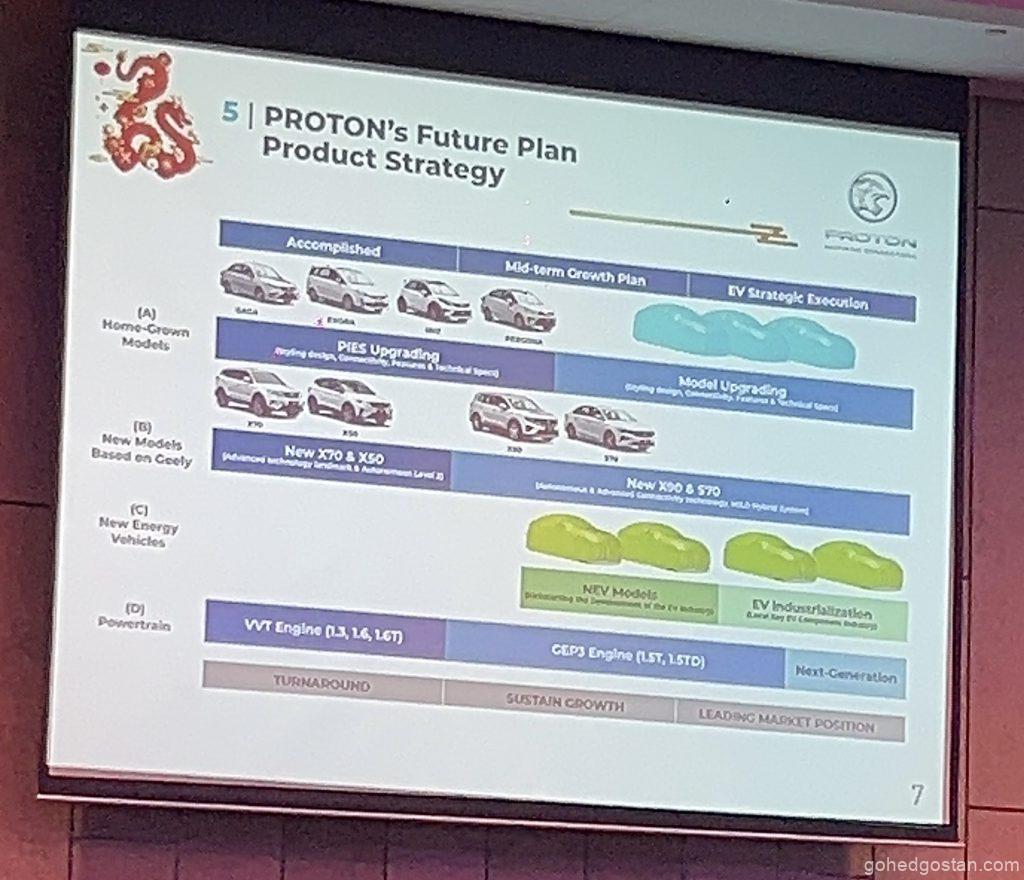 Selain itu, PROTON turut menyebut tentang “Kenderaan Tenaga Baru” sebagai kategori tersendiri. Di China, kategori ini merangkumi model hibrid, yang secara teknikalnya akan memasukkan X90. Namun, pembentangan PROTON menempatkan X90 di luar kategori ini. Pembentangan itu menunjukkan dua model “NEV” dengan subjudul “memulakan pembangunan industri EV”. Ini menunjukkan bahawa PROTON akan memperkenalkan dua kendaraan elektrik berasaskan Geely dan memulakan pemasangan tempatan dalam jangka pendek hingga sederhana. Terdapat dua lagi model di bawah bahagian generasi akan datang dengan sari kata “Industri komponen EV utama tempatan”, menunjukkan bahawa PROTON menyasarkan untuk meningkatkan bahagian alatb ganti sumber tempatan dalam EV masa depan mereka.
