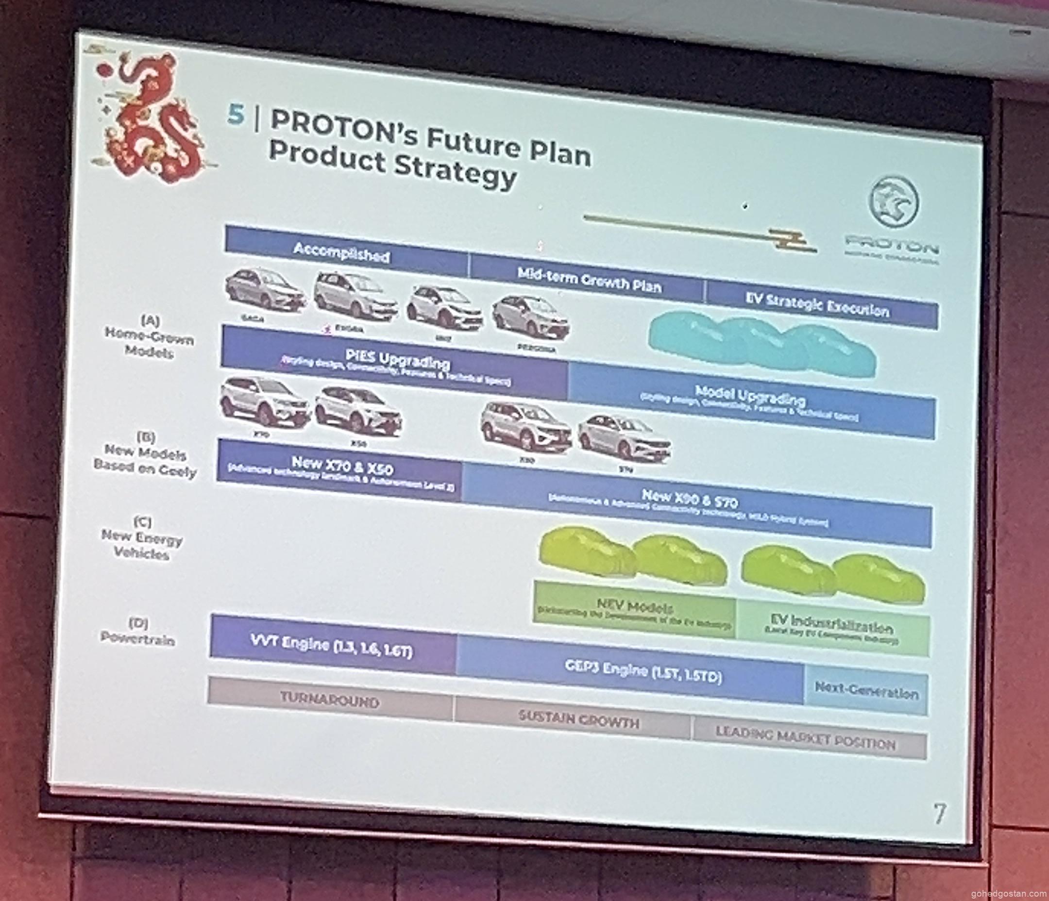 Selain itu, PROTON turut menyebut tentang “Kenderaan Tenaga Baru” sebagai kategori tersendiri. Di China, kategori ini merangkumi model hibrid, yang secara teknikalnya akan memasukkan X90. Namun, pembentangan PROTON menempatkan X90 di luar kategori ini. Pembentangan itu menunjukkan dua model “NEV” dengan subjudul “memulakan pembangunan industri EV”. Ini menunjukkan bahawa PROTON akan memperkenalkan dua kendaraan elektrik berasaskan Geely dan memulakan pemasangan tempatan dalam jangka pendek hingga sederhana. Terdapat dua lagi model di bawah bahagian generasi akan datang dengan sari kata “Industri komponen EV utama tempatan”, menunjukkan bahawa PROTON menyasarkan untuk meningkatkan bahagian alatb ganti sumber tempatan dalam EV masa depan mereka.